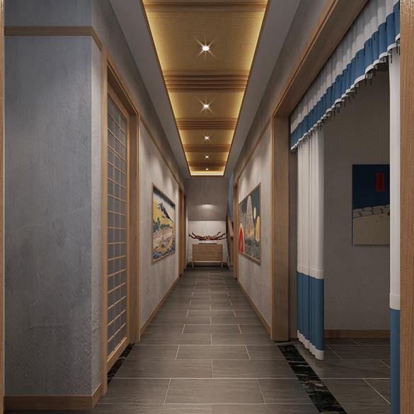 房间、过道运用了日式风格中的木梁吊顶,表现自然大气的同时,给人以清新别致,异国风情的感觉。房间里没有过多的造型,通过墙面材质的变化和软饰的映衬,在节省造价的同时还能较好的达到稳重、舒适的装修效果。过道踢脚线通过明亮的颜色效果,使原本不是很宽敞的过道看起来更宽敞,墙面主要通过木线条收边的宣传画效果,使其整个风格更加协调的同时,还能很好的达到宣传效果。过道地砖用比吊顶木梁更深的颜色,使整个空间层次感更强和更加生动。