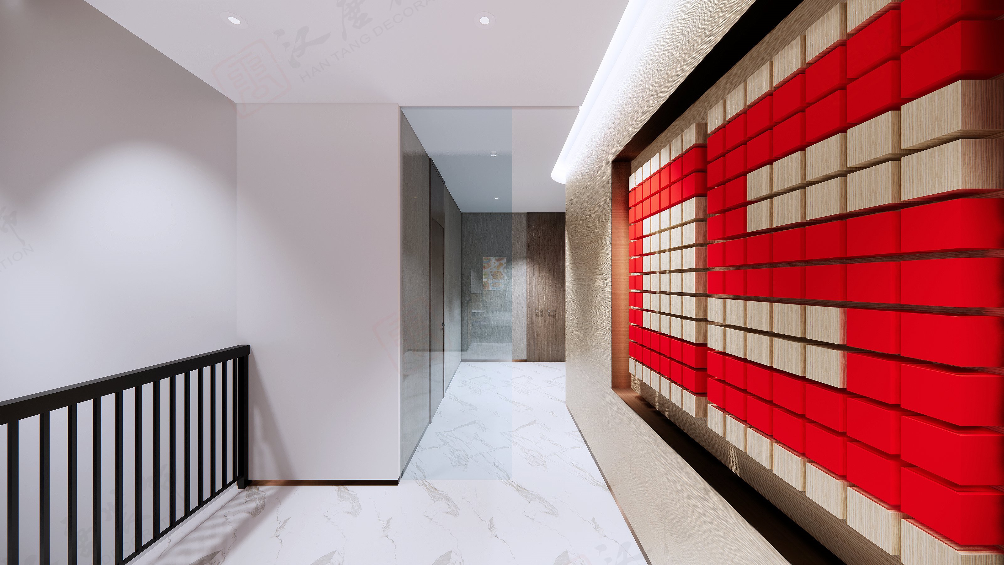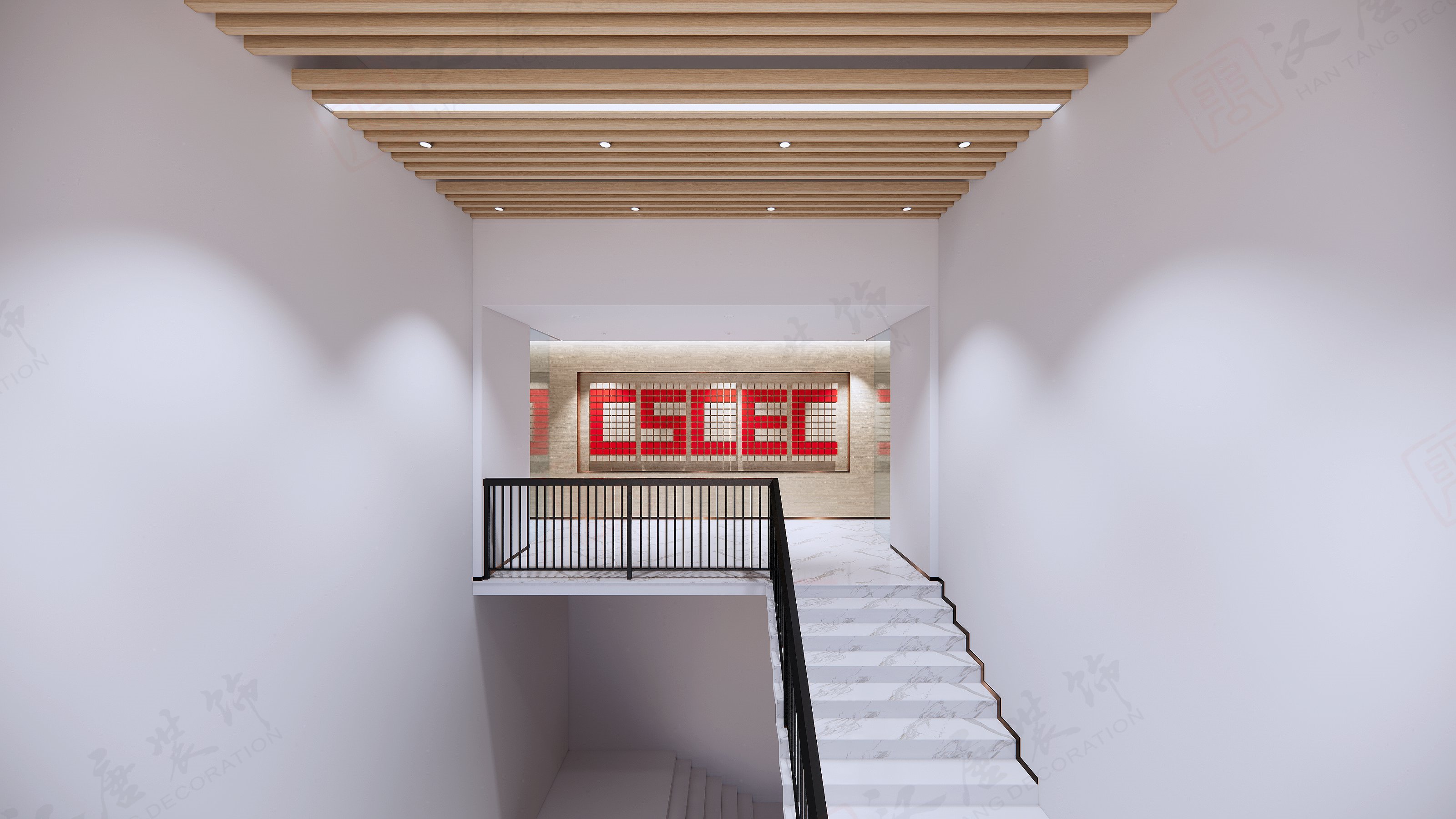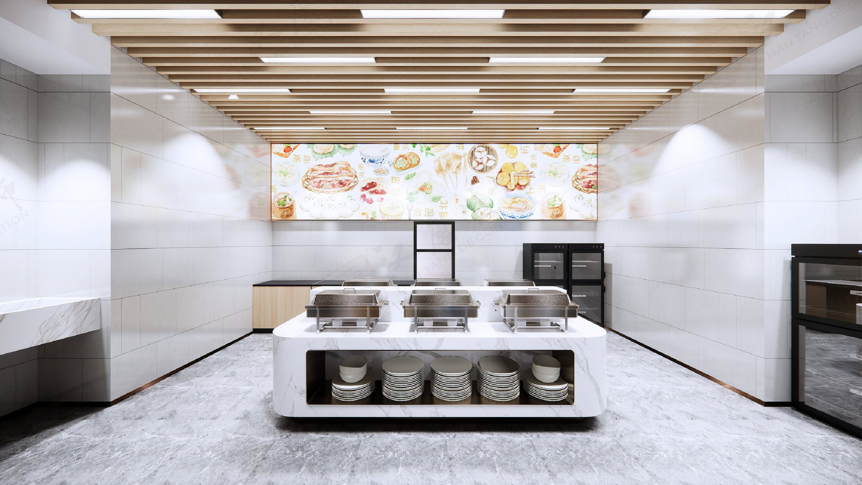 入口墙面采用积木形式做了一个文化墙,作为员工就餐区域,设计上做的休闲活泼一点,材质上也比较简单,地面白色地砖,吊顶用木纹铝方通,整体颜色比较温暖简洁。