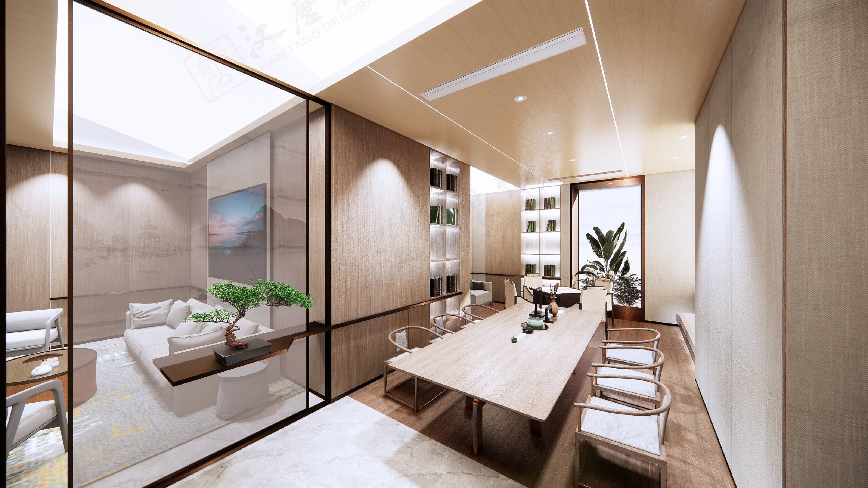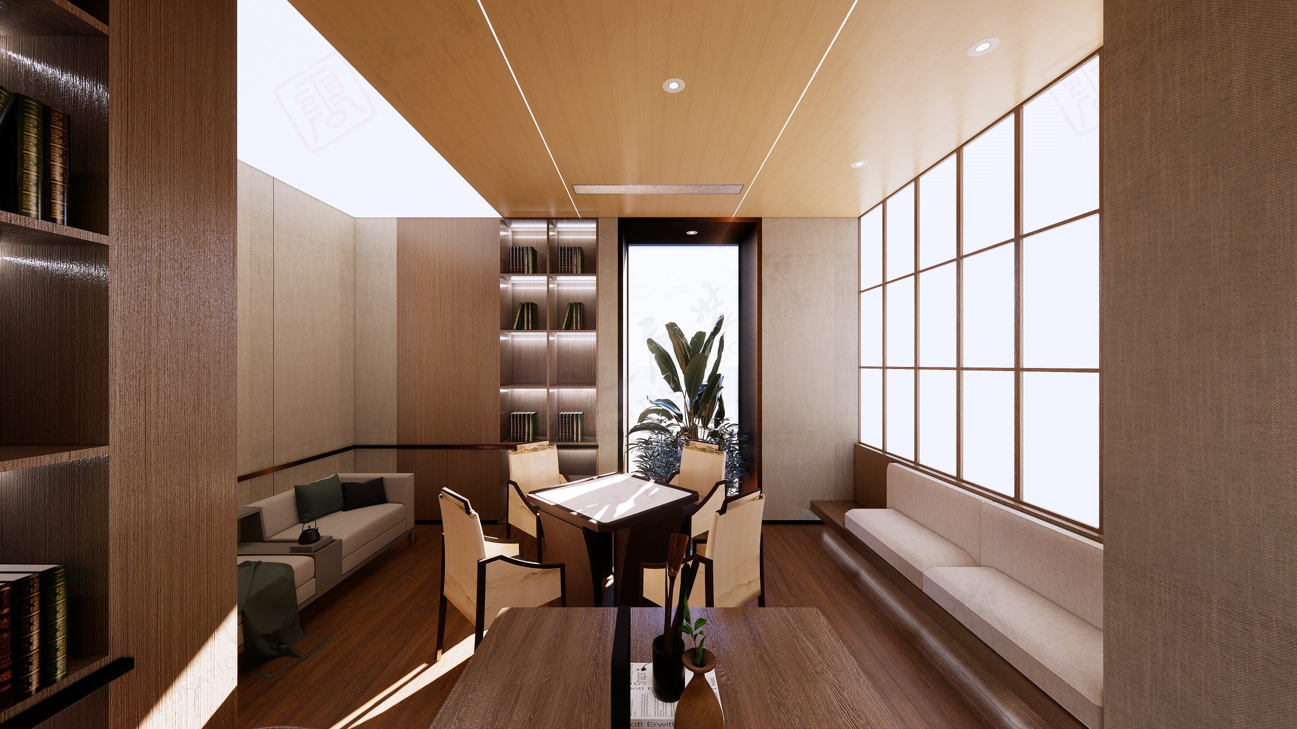 整体色调采用暖色布艺硬包及木纹色护墙板,吊顶采用了软膜灯箱模拟天空自然光,让空间明亮柔和,圆餐桌吊顶采用圆顶呼应,拉高了层高,让吊顶层次更丰富,整体风格偏新中式风格。