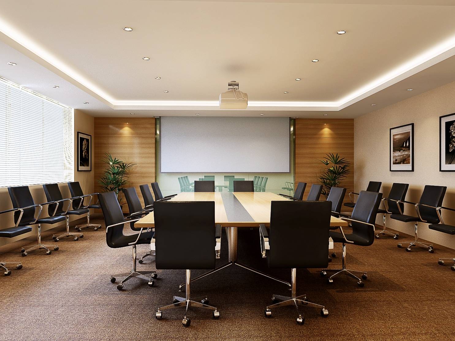 办公室装修会议室根据使用人数确定大小,会议室桌椅根据使用人数确定规格,不可过大,也不可不过小,例如:会议室考虑8个人用,按照人均占用长度为70-80cm,那么会议桌长度应控制在210-240cm为宜。会议室强弱电要布线到位,PC、投影灯设备有足够插座。会议室宜采用荧光灯照明,会议室要原理噪音区,隔断尽量选用隔音材料,保证会议室有一个安静的环境。
