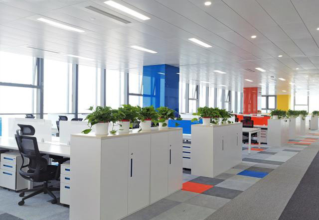 现在很多的写字楼都配有中央空调和新风系统,但室内出风口不一定刚好满足要求。需要装修公司委托专业人士延长或改造出风口,并需要吊顶工程配合。而在吊顶的工程当中,不管选用石棉板或矿棉板,都要用螺丝拉杆悬挂,只有这样才能经久耐用,用铁丝悬挂是绝对不允许的。而待到所有的办公家具进场后,强弱电走线需要随着办公隔断安装一起安装到每个工位,不能乱拉乱放,容易造成安全和使用的隐患。