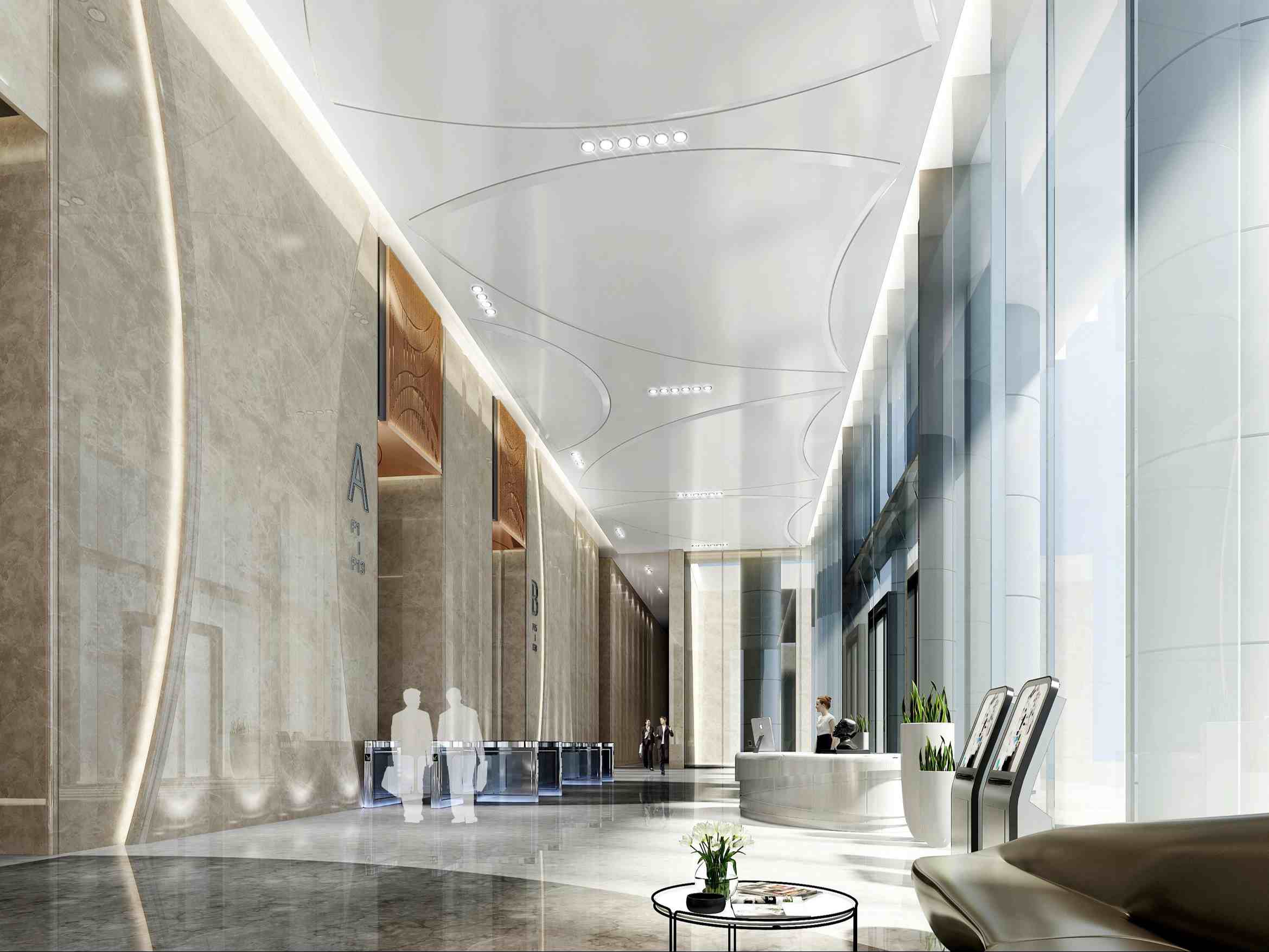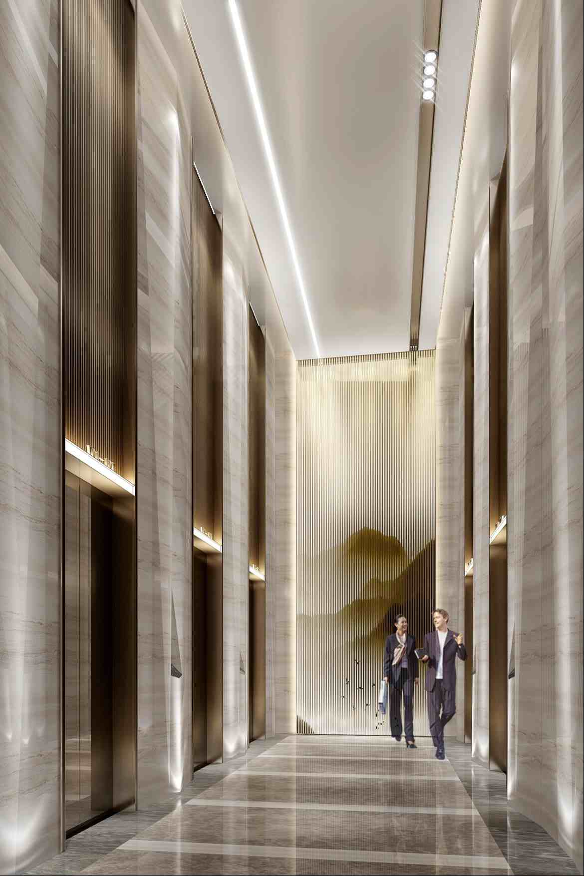 整个空间体现出了现代商务办公空间设计诉求,形式力求简洁大气。大堂背景被富有秩序感的渐变分割,墙面竖向折面的造型也让空间的立体感显得更加强烈,折面线条的设计更有气势。为了让整个更具有层次感,大堂的天花、柱子及电梯厅门头都延续折面的设计语言,用设计手法让空间形态更统一。