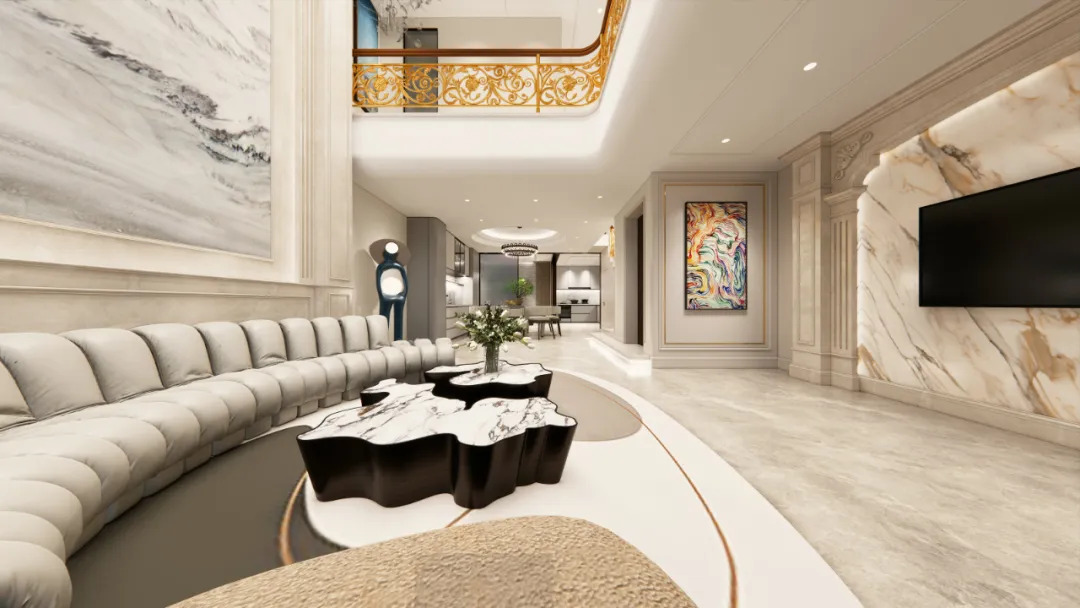 客厅挑空设计拉伸纵向尺度,拓宽空间开阔感与通透度。以大理石为底铺陈高阶质感,金属线条沿挑空栏杆、家具边缘点睛,搭配造型独特的沙发与艺术化茶几,浅色调基底融合玻璃幕墙引入的自然光线,让室内外景观自然交融,成为家庭社交、休闲的核心聚场。
