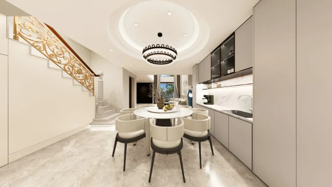 餐厅与客厅形成开放式互动布局,圆形吊顶呼应餐桌形态,定制餐边柜以木质温润质感兼具收纳与展示功能,精致金属吊灯聚焦空间仪式感,构建温馨且富有格调的用餐场景,顺滑衔接生活场景过渡。