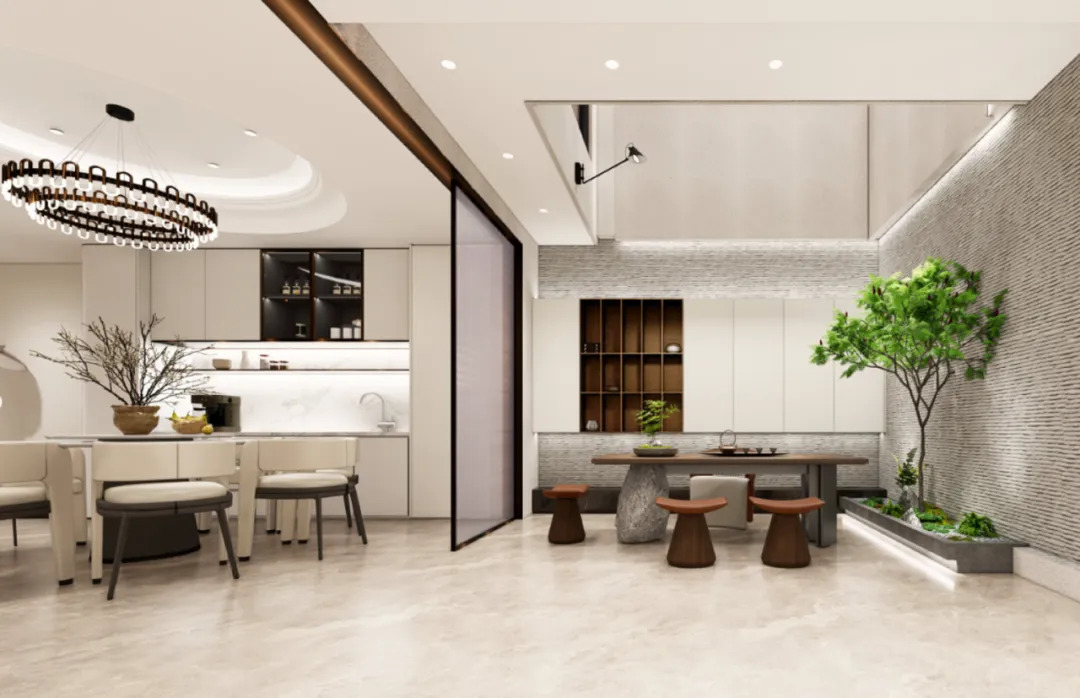 庭院作为室内外过渡的“自然序章”,以白沙铺地、砾石收边,构建简洁几何秩序;乔木错落、绿植点缀,与休憩座椅、墙面形成场景互动。