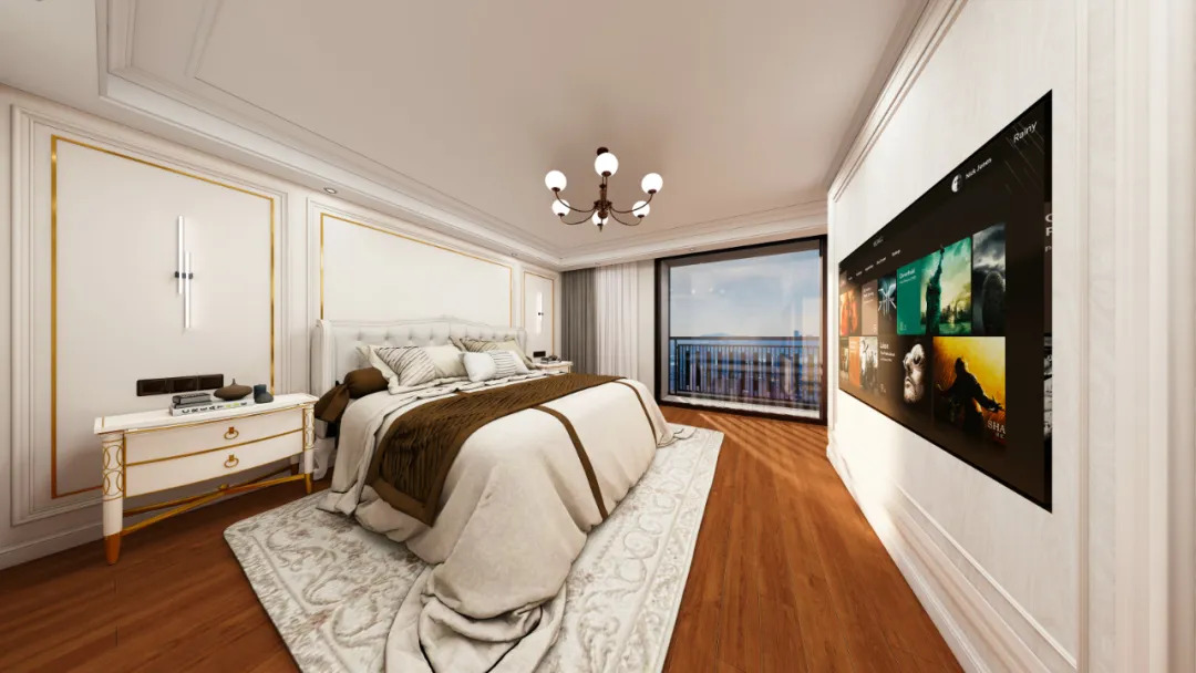 主卧以米白、浅棕为基底,简洁家具线条融合金属装饰细节,平衡舒适与轻奢质感;大尺度飘窗借玻璃通透引入充足光线与户外景致,暗藏灯带渲染温馨氛围,筑就放松睡眠环境。
