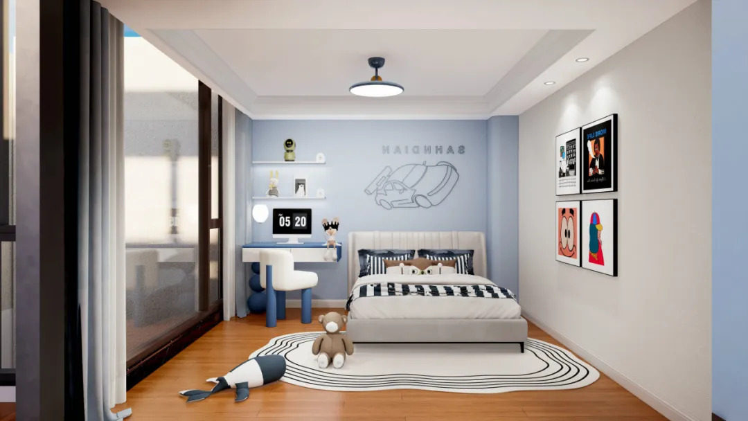 儿童房针对性别差异,分别以蓝色(男孩房)、粉色(女孩房)为基调,搭配童趣金属装饰、专属学习区灯光,打造童趣满溢的成长空间。