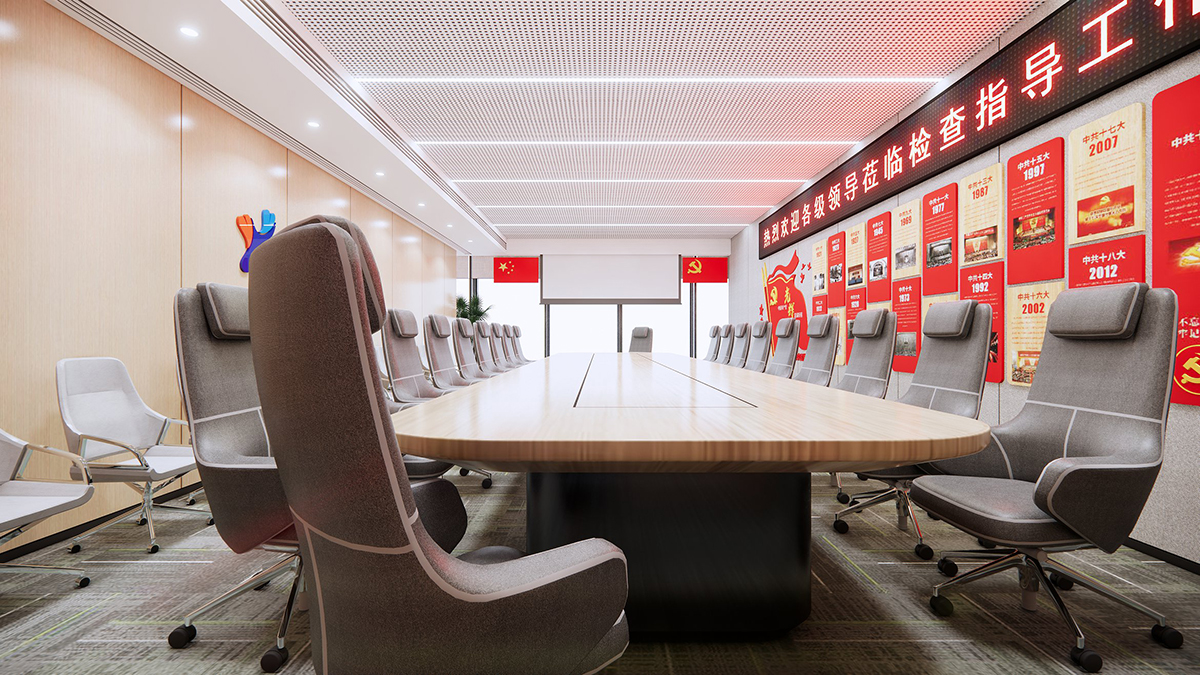桌椅排列规整,方便参会人员就座与观看演示内容。前方设置大屏幕,满足会议展示需求。两侧墙面悬挂企业重要人物照片与荣誉证书,彰显企业实力与文化。