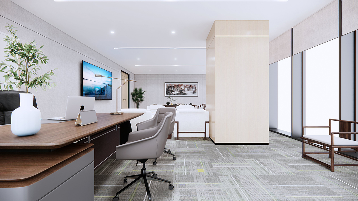 办公桌选用优质实木,纹理自然。墙面采用壁布,质感柔和。地面铺地毯,提升舒适感。色彩搭配上,以中性色为基调,搭配木质原色,营造温馨、沉稳且专业的氛围。
