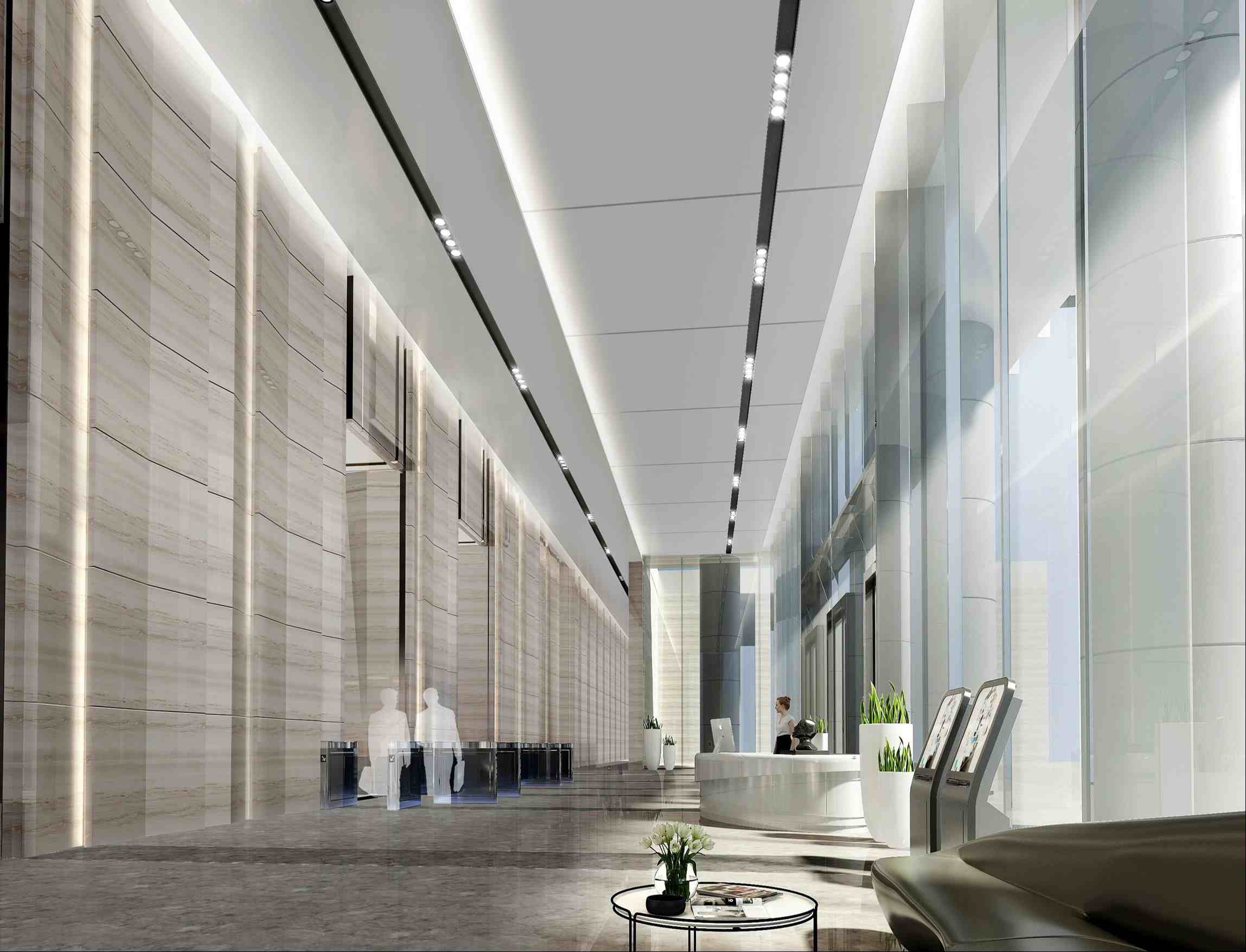 整个空间体现出了现代商务办公空间设计诉求,形式力求简洁大气。大堂背景被富有秩序感的渐变分割,墙面竖向折面的造型也让空间的立体感显得更加强烈,折面线条的设计更有气势。为了让整个更具有层次感,大堂的天花、柱子及电梯厅门头都延续折面的设计语言,用设计手法让空间形态更统一。