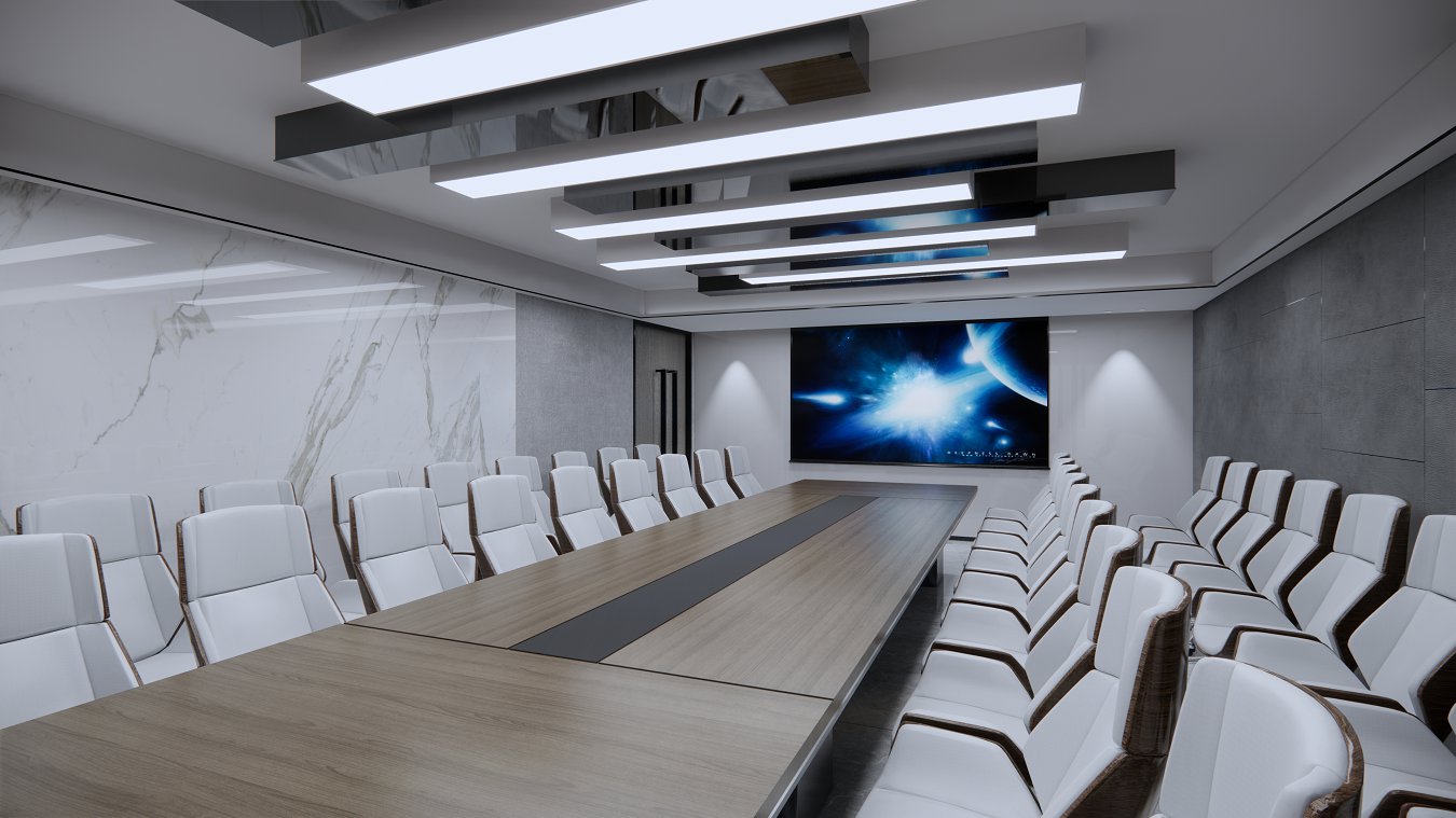 设计说明:本方案的业态为金融科技公司,通过与甲方的多次沟通,把设计风格定位在轻奢的基础上体现科技感,以体现公司在行业中领先的地位。地面选用浅咖灰色系仿大理石地砖,以此呈现轻奢格调,也贴合公司企业意欲呈现的高端调性。背景选材白色大理石纹路岩板以呼应地面的整体感官,极简的顶面来平衡空间的关系,采用线性光源满足照明需求,灯带流线犹如股票市场上一根根浮动的K线,深扣主题,传达出冲击,动态的视觉体验。