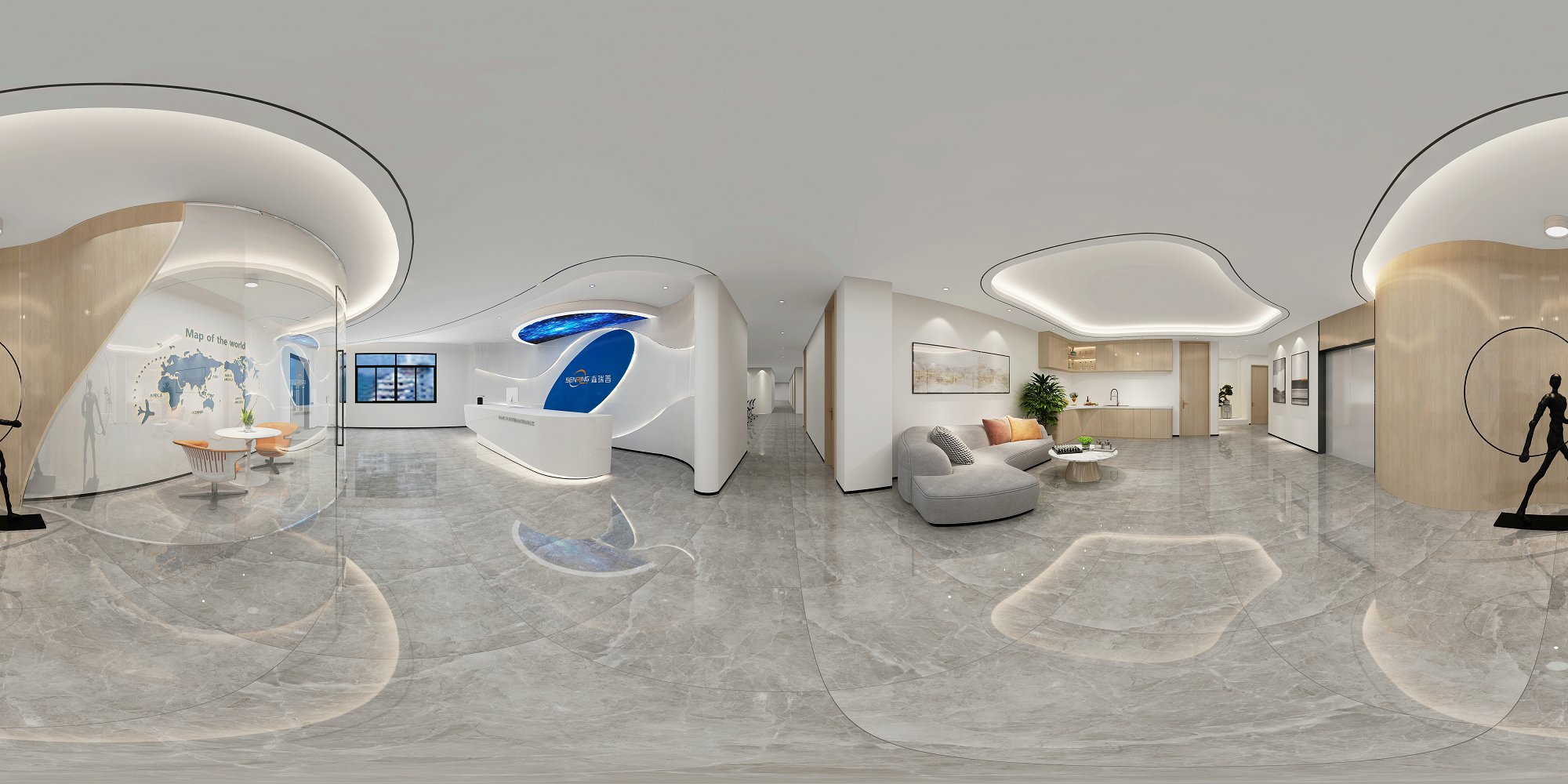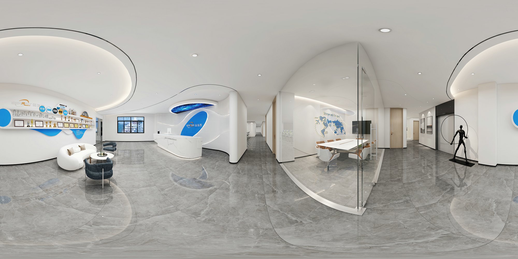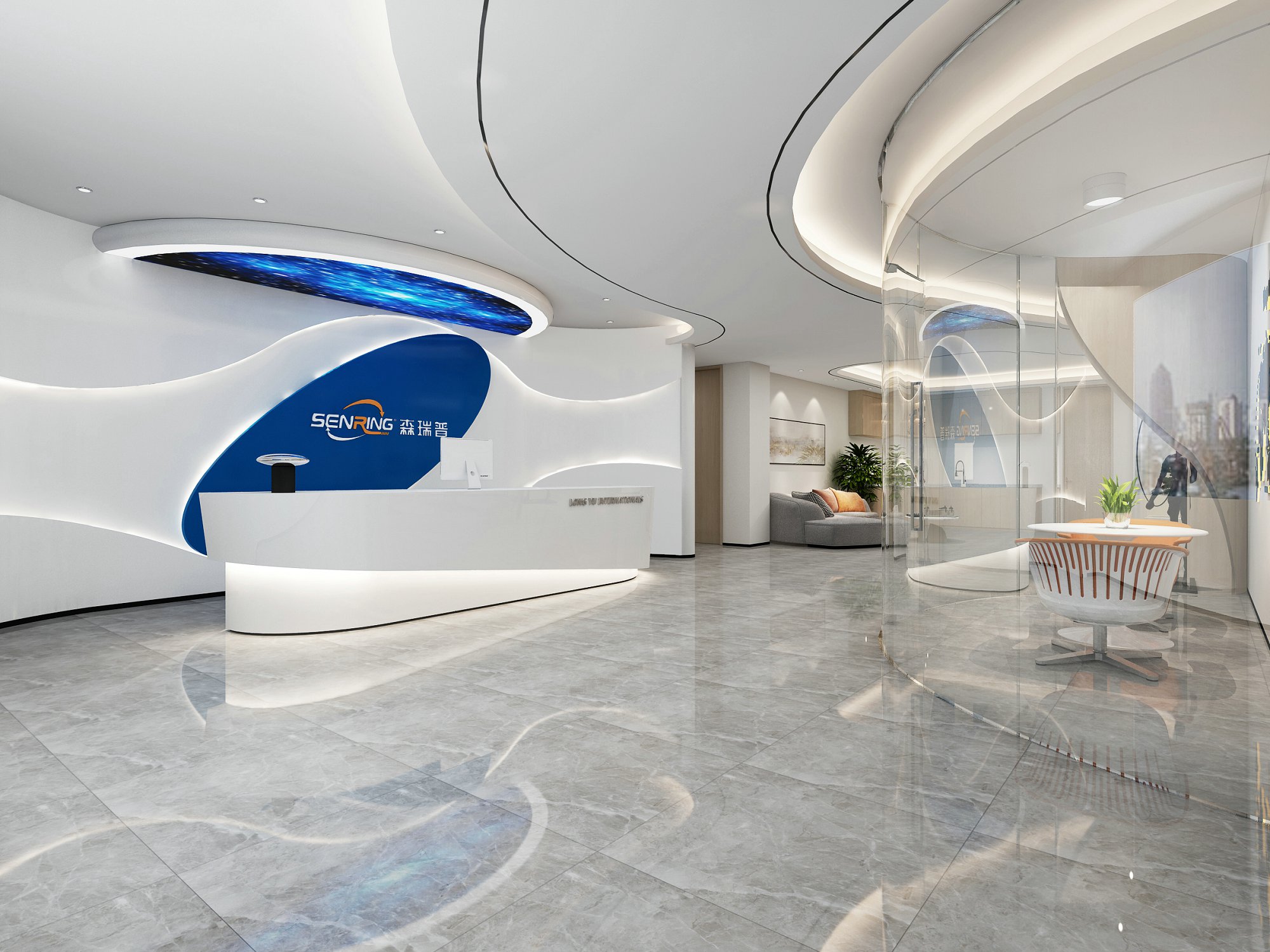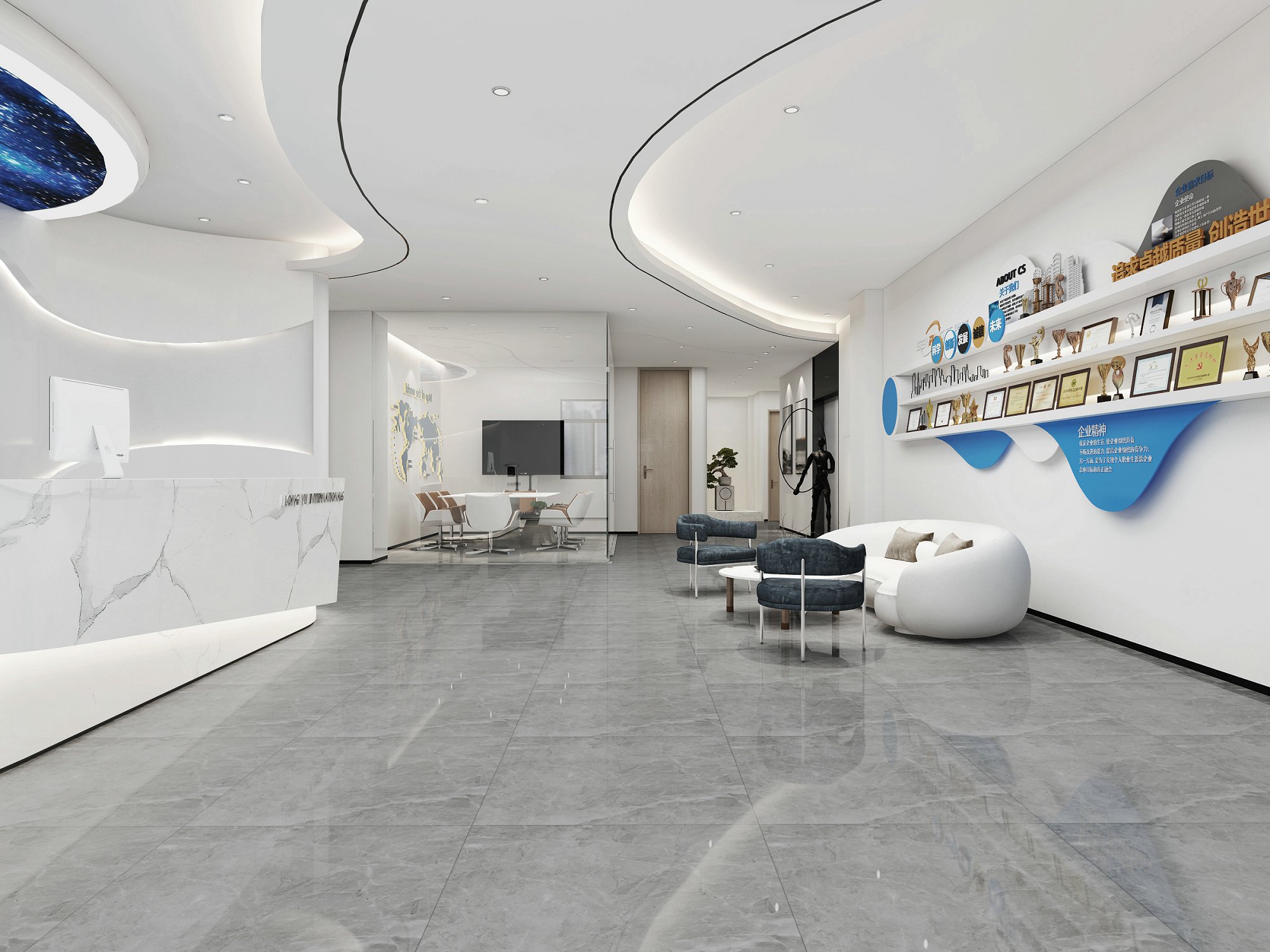 设计说明:本项目甲方为专业研发生产导电滑环公司,整个空间结合产品以及公司LOGO采用曲线进行设计表达,柔美的曲线使得空间层次分明,视野开阔。用少许的蓝色给整体注入企业特性,点亮空间层次,浅色调将原本光线不足的缺点进行弥补。整个设计流动开放,突显作为整个公司的接待开放空间的作用。