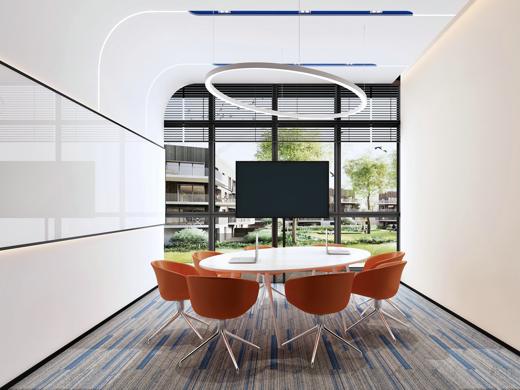 此空间营造了天花的弧面设计,地面采用脚感较为舒适的定制花纹地毯,加入蓝色线条引出logo色,另墙面设计的色彩为浅姜黄,凸出年轻人的时尚活力,色彩丰富而和谐的小会议室空间,现代简约而不单调。
