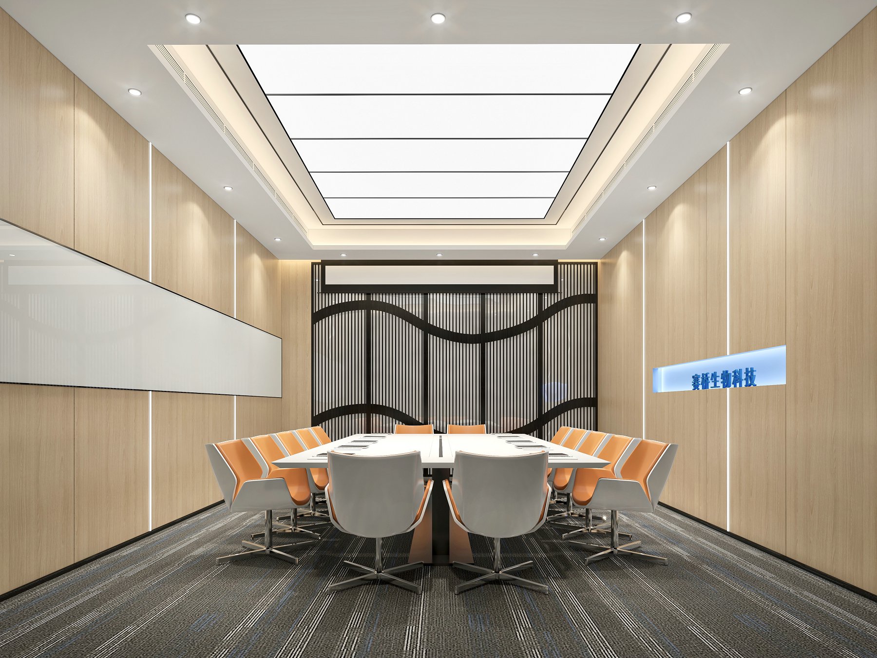 此空间整体凸出职业感和现代感,大面积烤漆玻璃设计为凸出面,既满足高管开小会时的书写作用,又体现出空间的整洁美观。天花的设计简约不失庄重,空间利落干净。