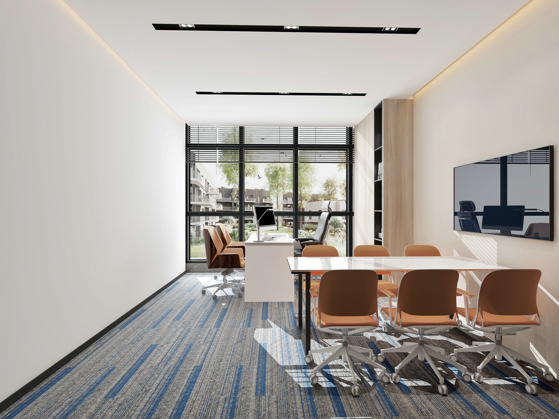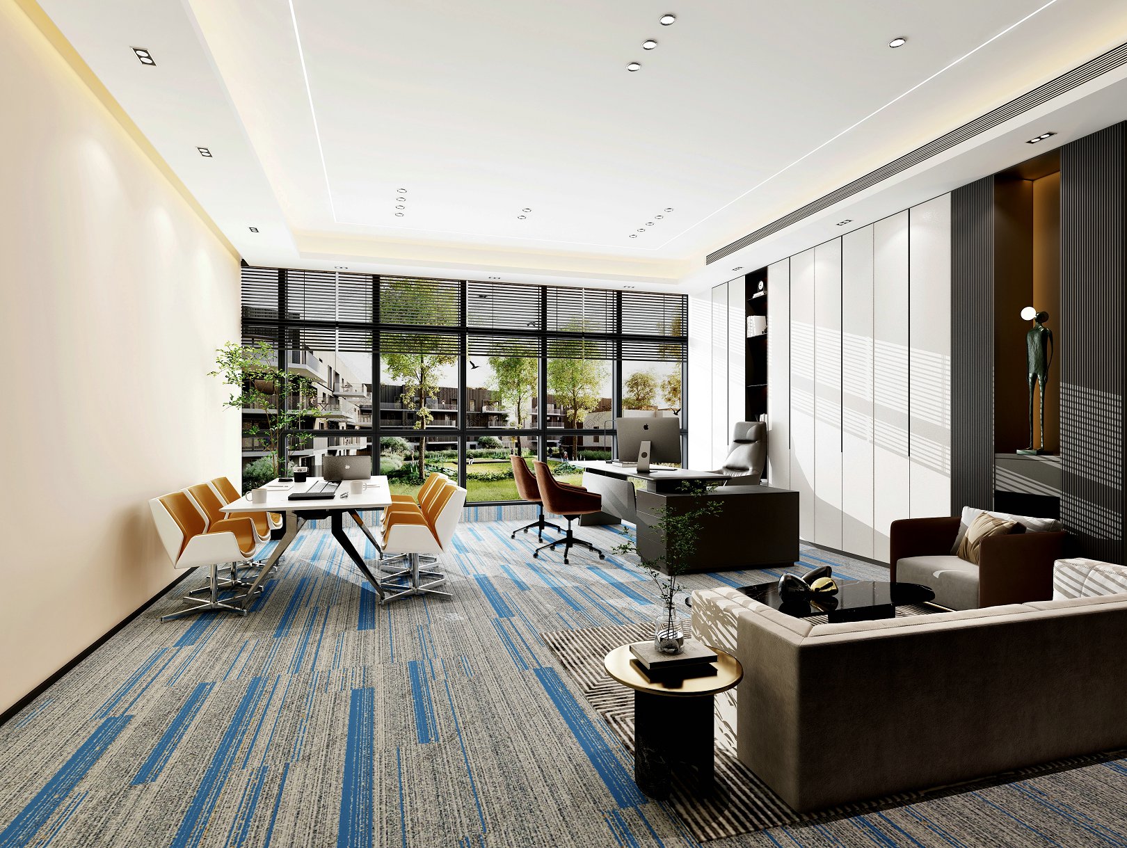 墙面采用墙布处理,配合40mm宽极简铝合金踢脚线的收边,线条简单。家具的选择上采用极具现代化风格的代表,烤漆材质的台面,姜黄色单人椅的搭配,使高管的会议区也显得高端有活力。天花设计极简线性灯,配合叠级处理,暗藏灯光,营造舒适活力却不失职业感的总经办空间。