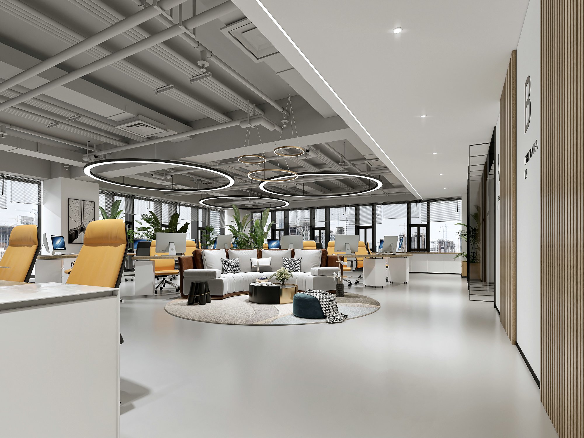设计说明:本案的主体设计以“现代科技风”为主题,即在现代简洁风格中合理地融合科技风元素,达到和谐舒适且轻松的工作氛围,又不失科技感。