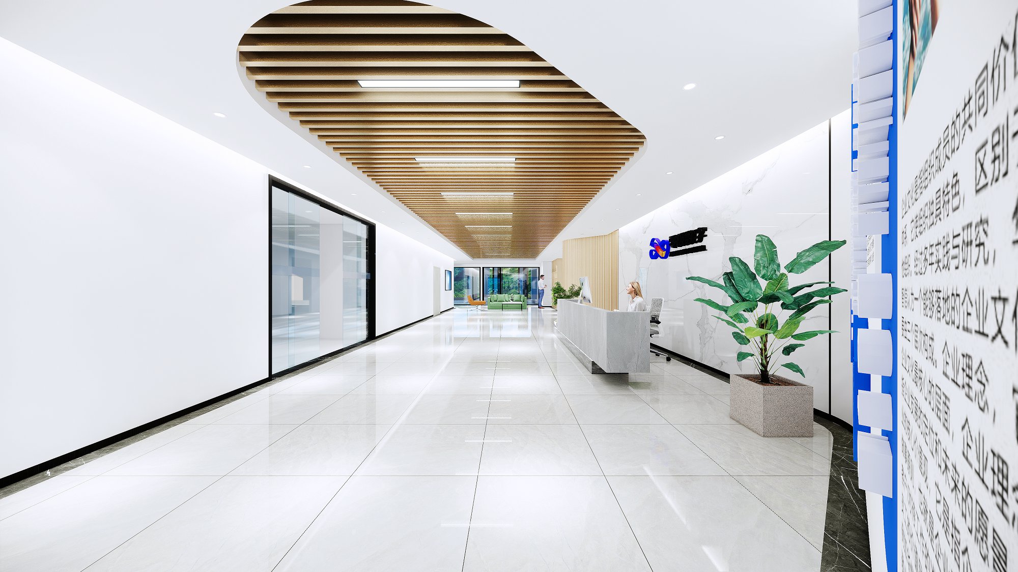 前厅访客从中心电梯厅进入宽敞的接待大厅,其极具视觉冲击力的独特设计带来强烈的视觉印象,富有活力的公司文化氛围,它集聚了接待、社交、品牌展示、面试、非正式会议室等多功能的空间,成为一种相对开放和相对私密的空间并存状态,活跃的氛围和私密让此处富有生气。