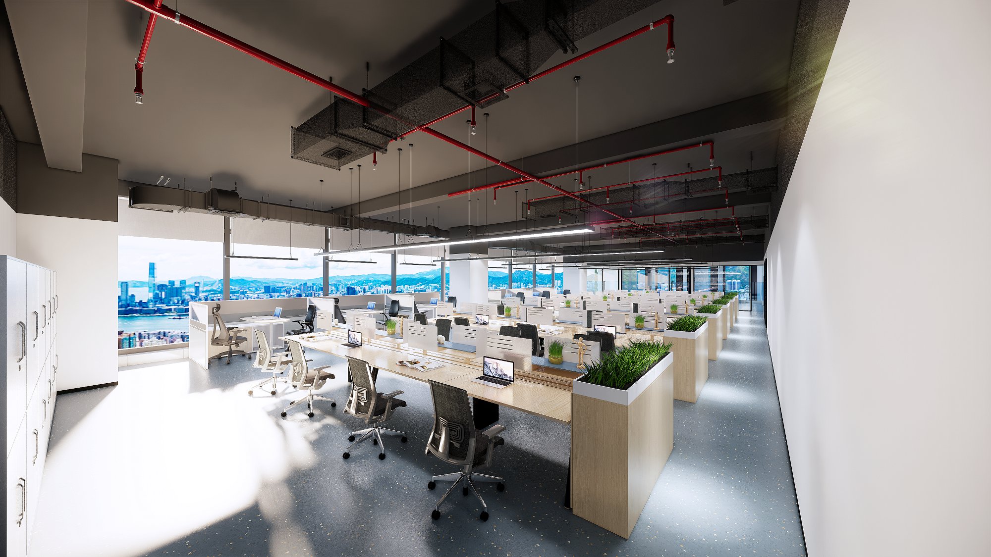 开放办公桌沿建筑周边排列,最大化利用户外自然光照与景观视野,从而有效调节空间使用者的心情,并能舒缓压力。围绕着开放工作区规划了许多协作休闲区域和书写板,以满足员工随时随地的探讨和头脑风暴,这样的区域设计意在宣扬开放、互动、年轻活力与协作的重要性。
