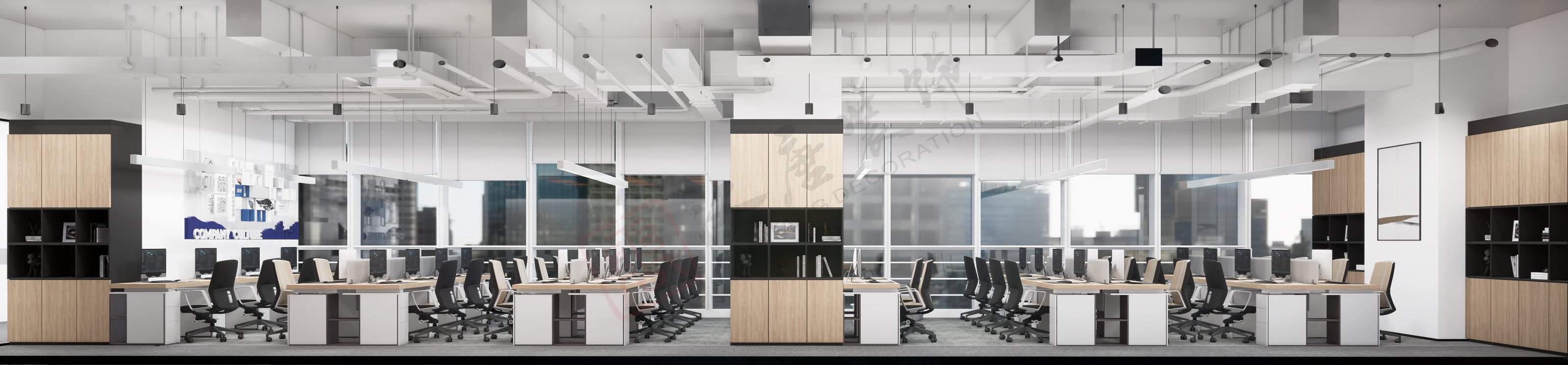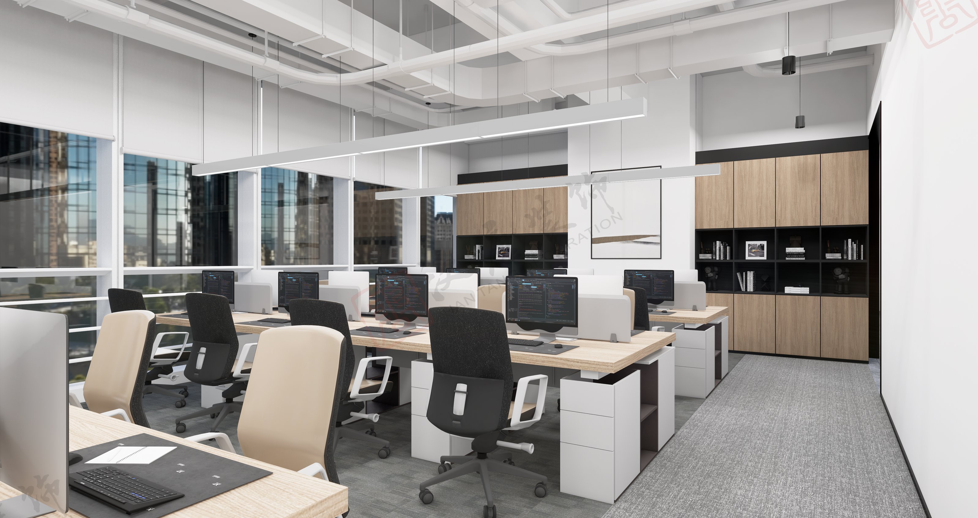 开放办公区走廊和卡位区用不同纹理地毯铺设,天花及墙面刷白色乳胶漆,增加空间的通透感。