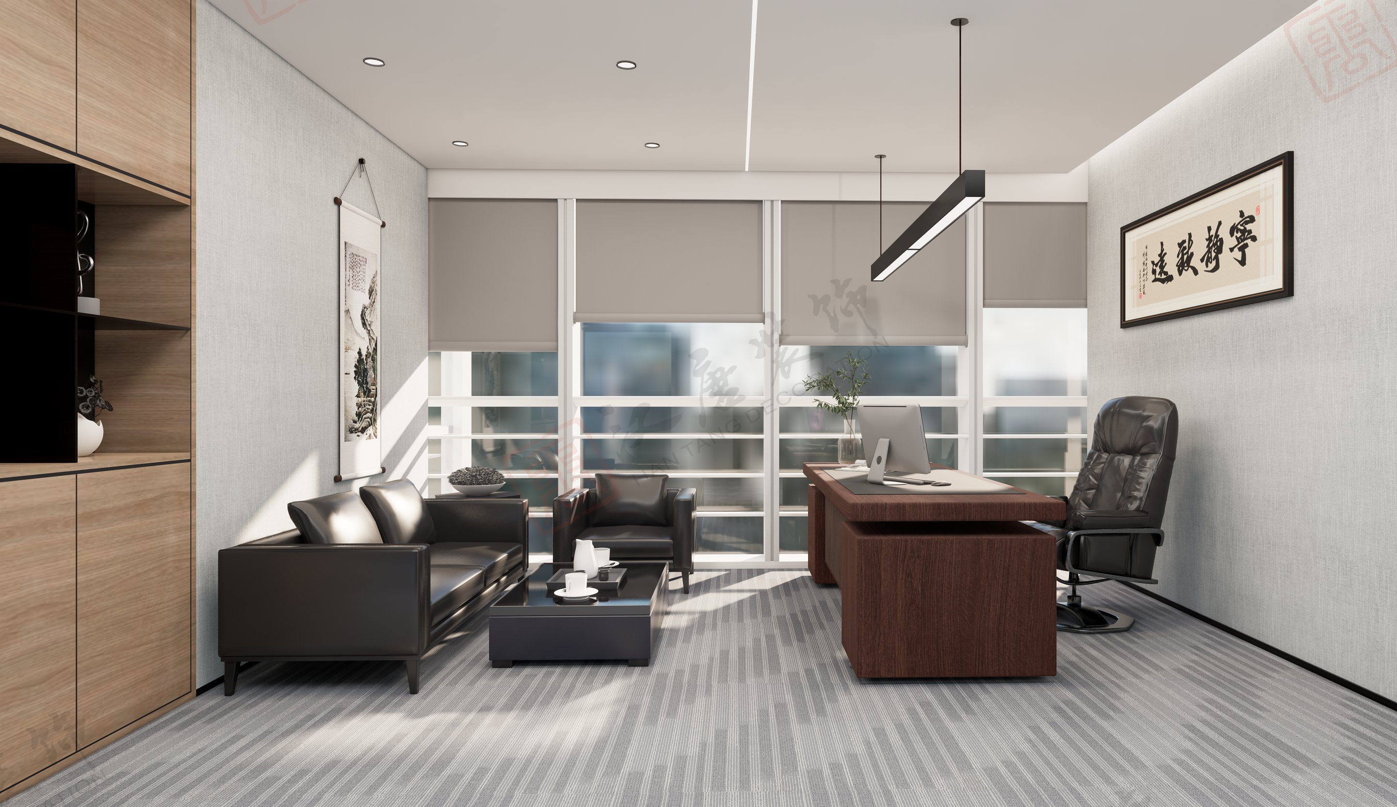 总经理办公室,墙面浅色墙布搭配深灰色条纹地毯,天花通过极简手法利用灯带做区域分割。
