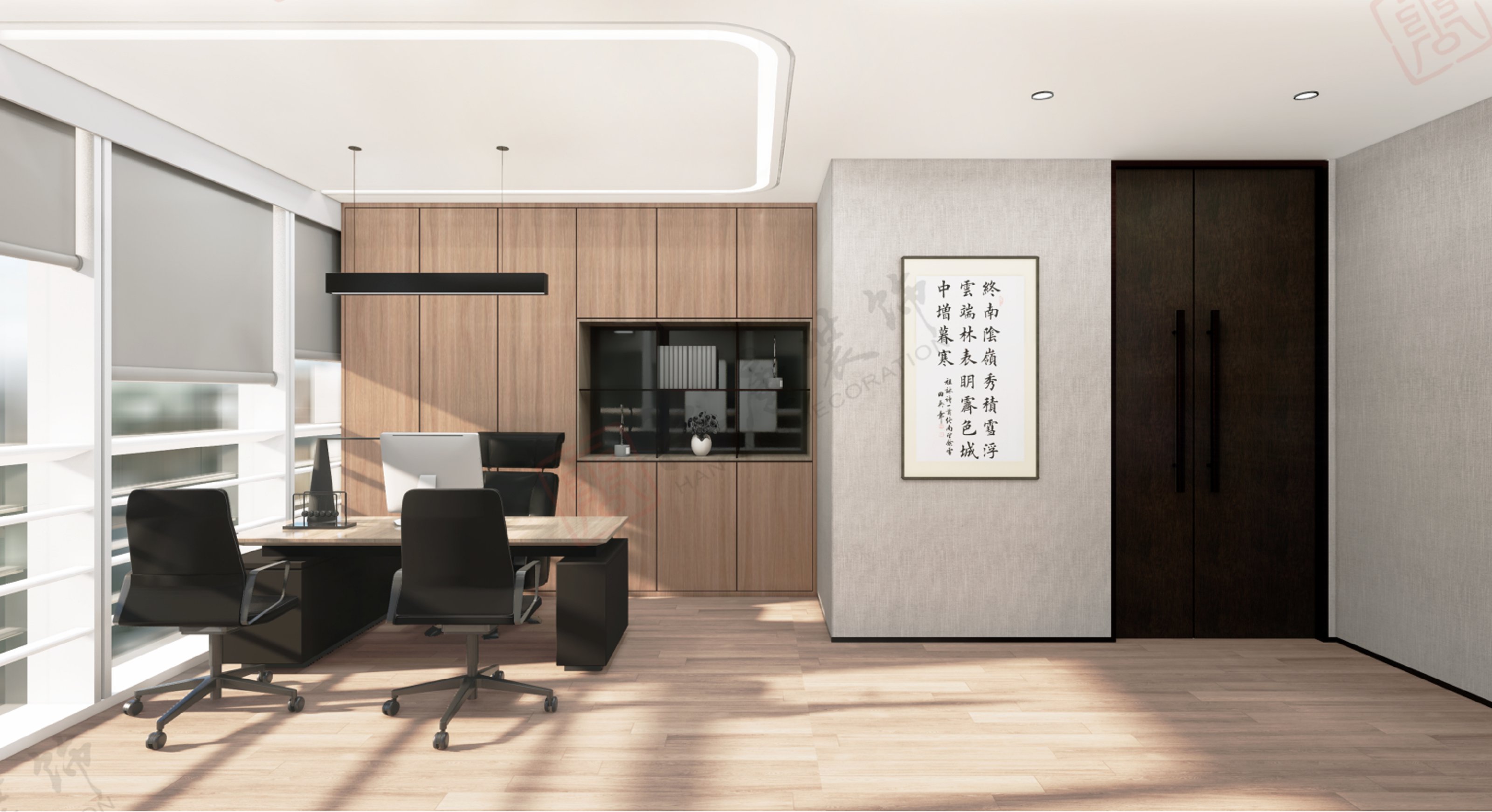 董事长办公室利用不规则空间,分割不同区域,设立品茶区,办公区和景观区;木地板的材质给人温馨感。