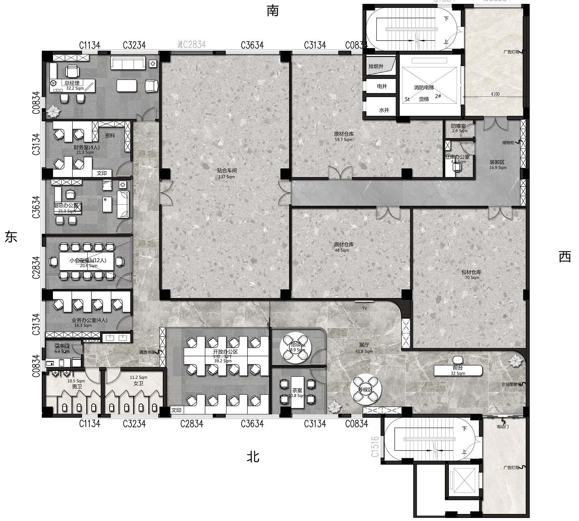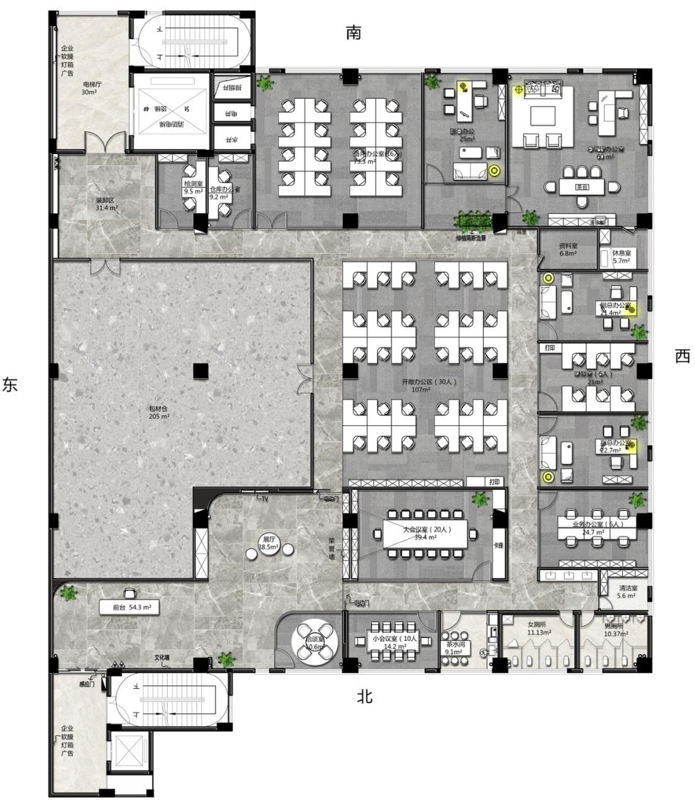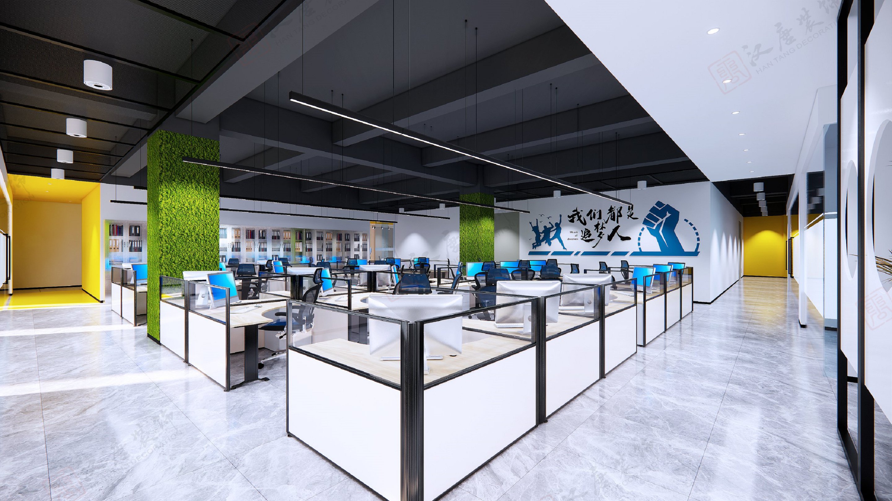 背景墙用金属拉丝护墙板,吊顶采用金属网,整体风格科技感比较强。 当人们进入空间后会产生怎样的情绪感知,往往是设计师探索与思考的核心。接待形象墙是最重要的识别记忆,所面对的群体,除了员工,更重要的是提升客户与供应链等人群的记忆点。 荣誉展厅去繁就简、点到为止,使装饰充满趣味。基于空间的比例与尺度以错位的隔板设计展示墙,横条灯带的设置,在墙体与灯光的映衬下十分醒目且质感十足。 与前厅色调相呼应,品牌展示区同样以白色铺底,金属饰面板点缀,吊顶采用裸顶喷深灰色,拉高视觉高点,加上艺术吊灯的点缀,使空间得到很好的延伸。 高效、舒适是作为办公空间设计所需要塑造的环境艺术,在温暖而舒适的环境中办公,并体验空间极致的艺术魅力,作为设计的本质追求。对空间进行分割组合,走过走廊,两侧都为办公区域,但空间开合有序,显现灵动。大量采用暖调破除办公冰冷的氛围,缔造温暖而舒适的办公环境,让员工在办公瞬间享受瞬间。 天花吊顶采用裸顶喷灰,让整体空间感更高,柱子采用仿真青苔绿植做装饰,局部通道用明黄色做点缀,让整体空间气氛活泼融洽,更具活力。 会议室秉承现代简约的设计宗旨,合理分区,沉静讲究,传达着清新的质感与内涵,这同样也是品牌调性的空间体现。 总经理室四周的视野开阔,为办公提供了一个舒适雅致的环境。大大增强人在空间无意识的情感互动,在与空间对话的瞬间便可激发灵感。