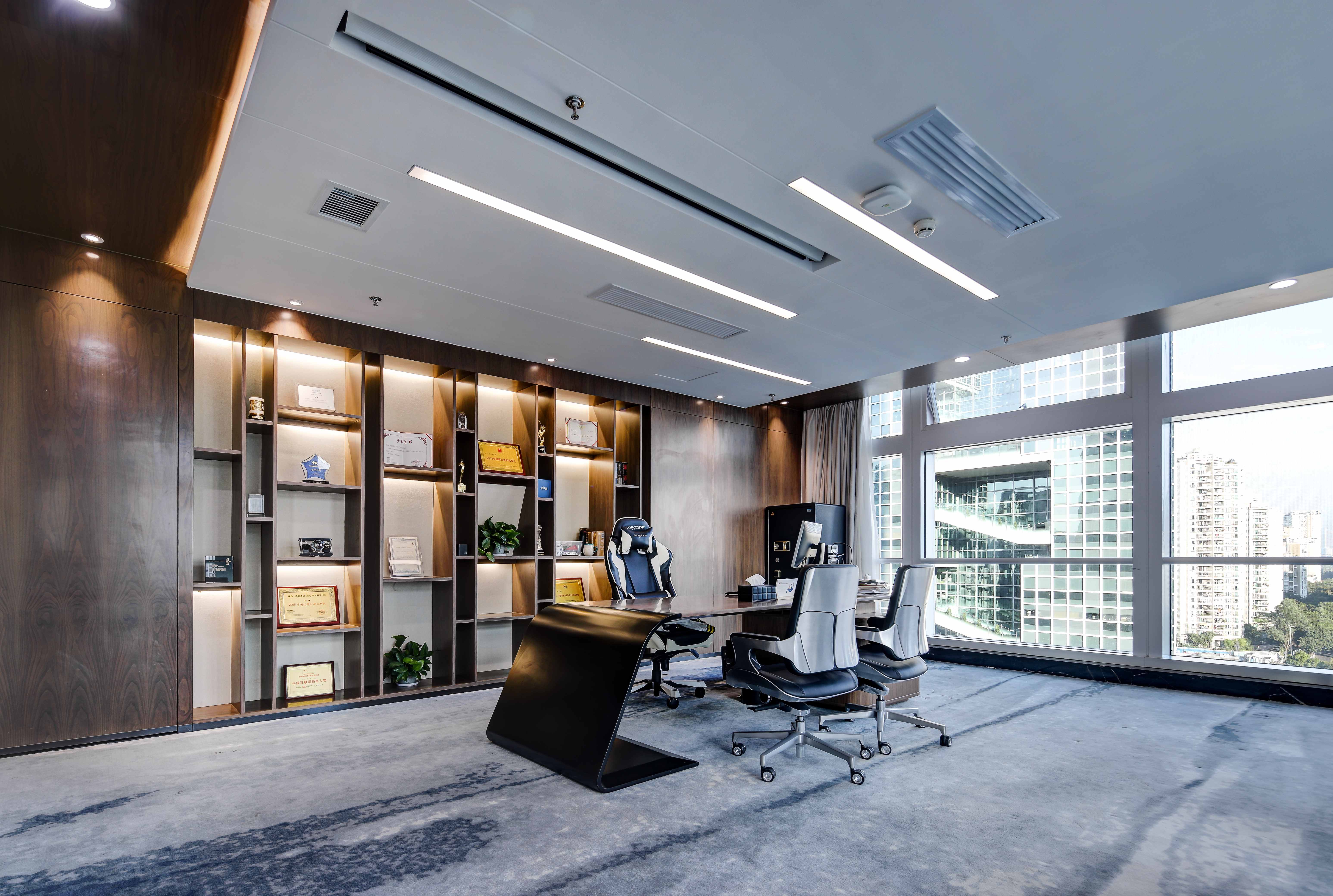 白灰色调中,一抹抹亮眼的科技蓝令意境升级。不妨一起沉浸其中,激荡灵感,畅想未来。同时,渐变元素带来了动感,巧妙地分割空间,加深了层次感。不同线性灯的布置,令空间依据功能分别呈现俏皮、庄严、休闲等不同特点。作为呼应元素的挂画是设计的诱导者,也引领着来访者的视觉动线。接待、办公、会议、休闲……多功能布局满足了办公的使用需求,让空间价值实现最大化。