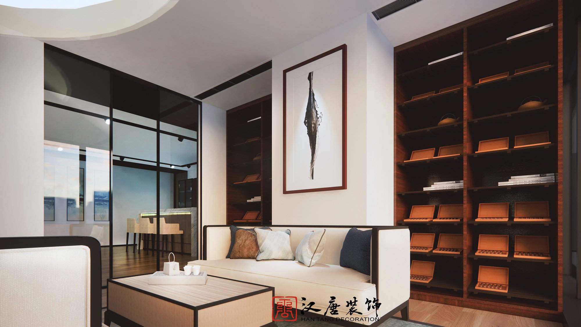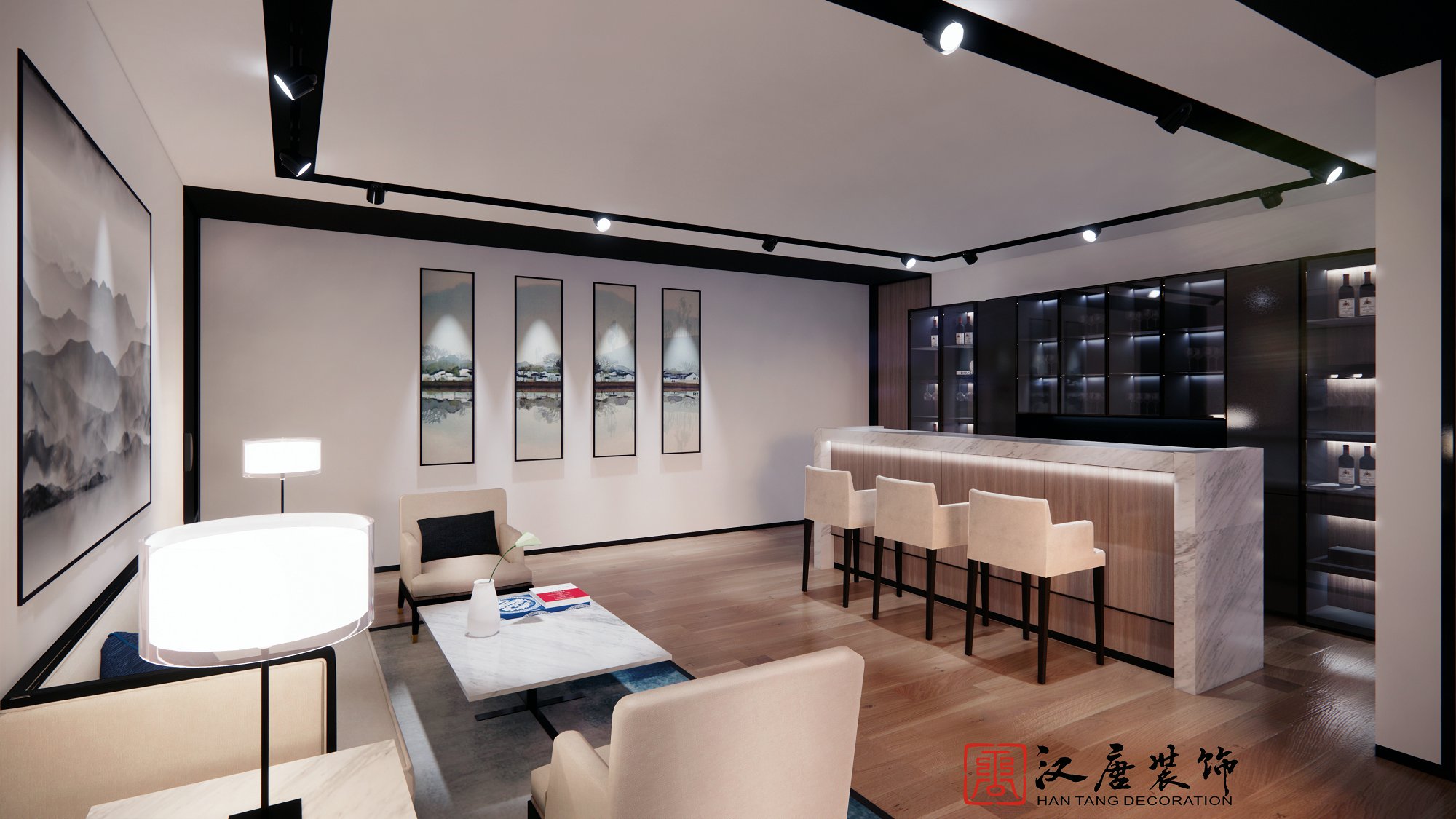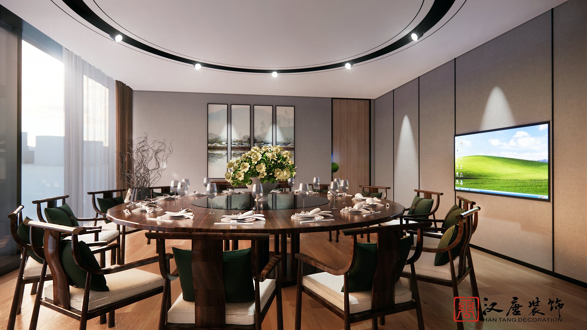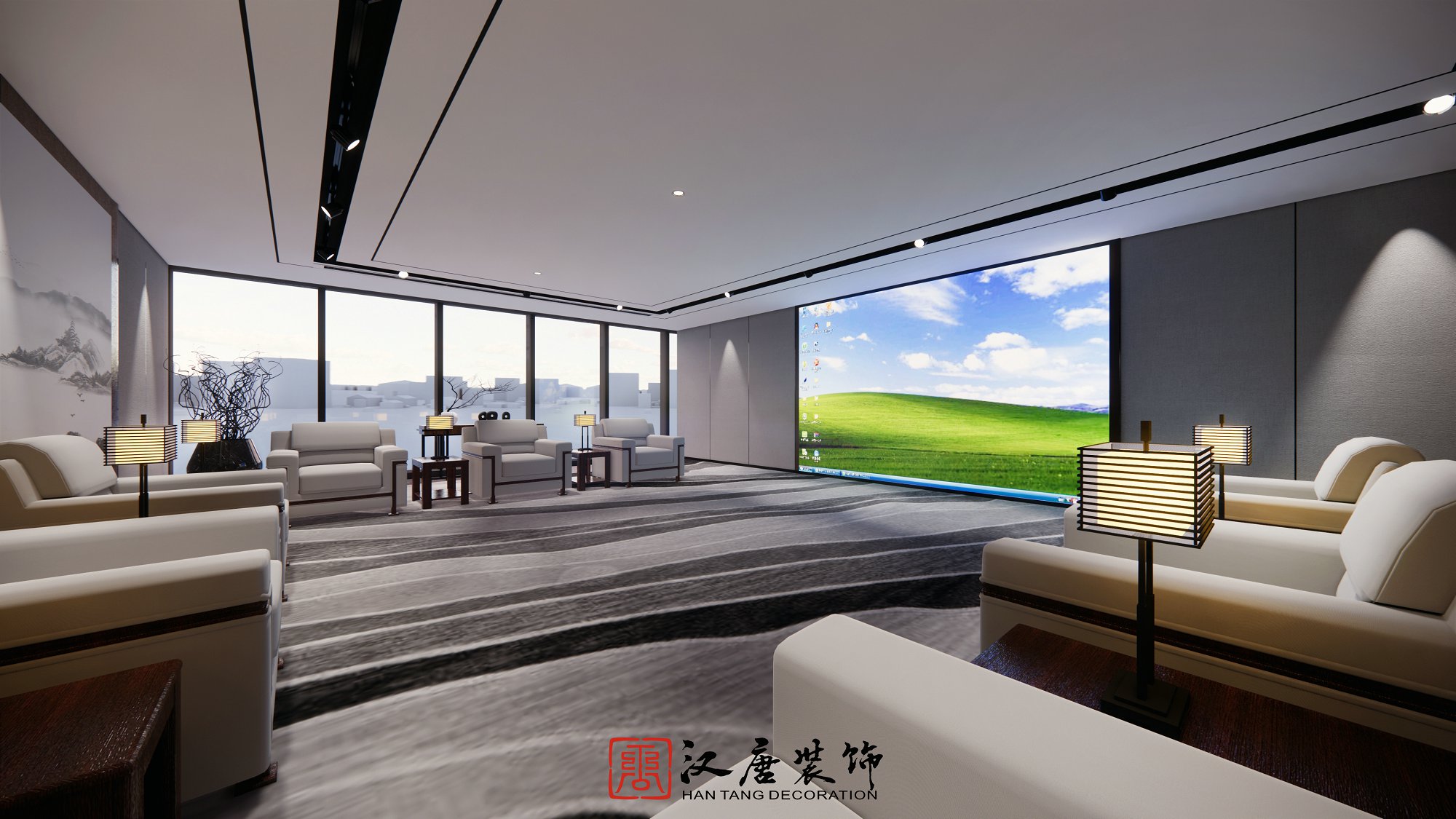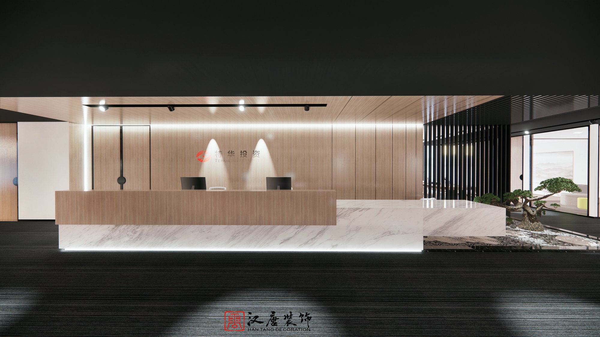 内嵌式线型灯带作为现代材料介入地面、顶面与墙面,隐性限定分割空间的同时,在纵深上形成规则的框景,聚焦视线。前台的大理石与木色调的面板搭配旱景,营造出现代中式的文化和公司的源远流长生生不息的文化结合。玻璃作为空间的另一个界定分割材质,在灯光的渲染下,不断映射灯带所形成的线条,无限循环,折射出丰富的空间层次。