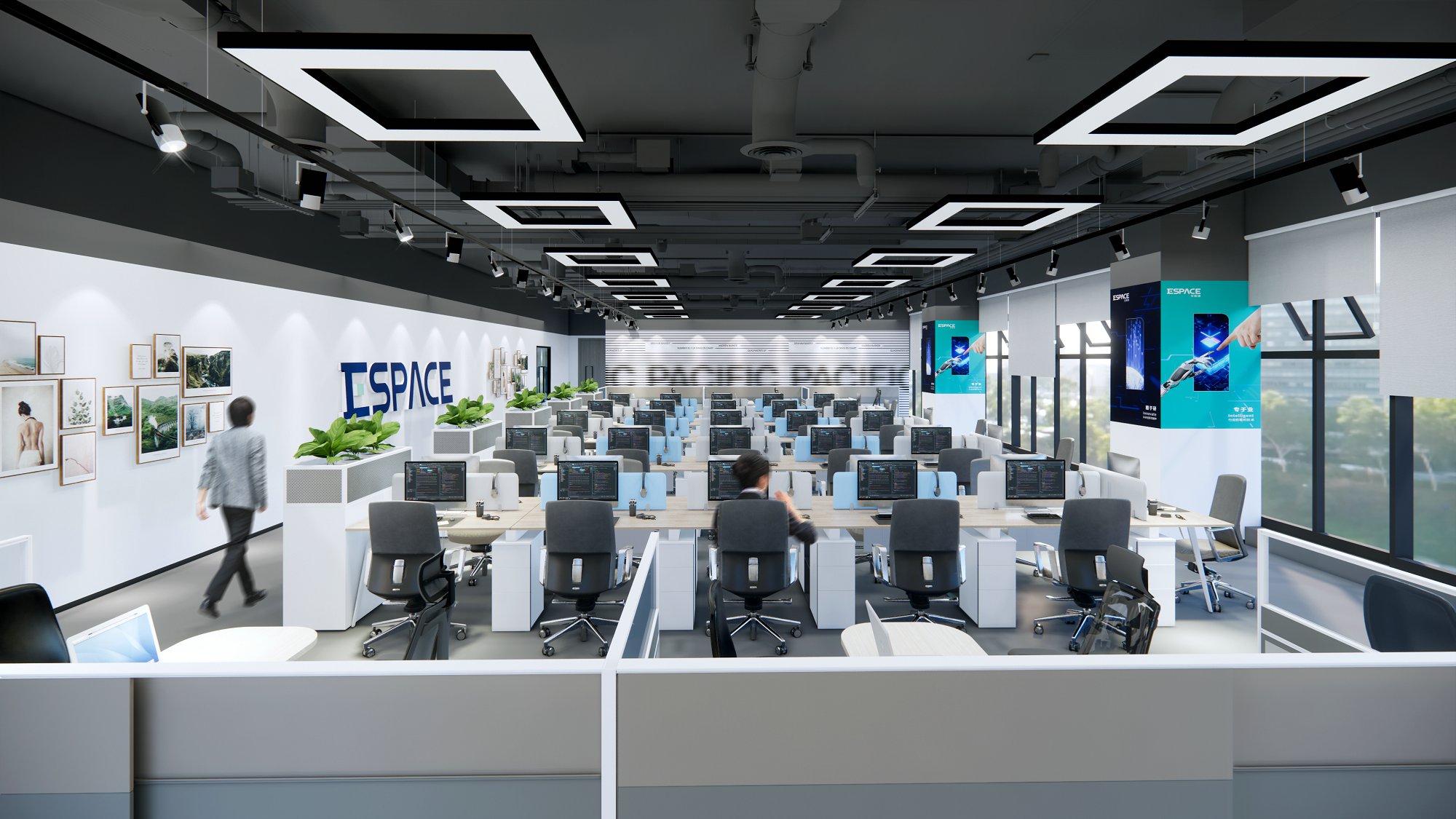 开放办公区的天花是作为裸顶喷漆处理,让人第一视觉效果感觉到空间很大。条形灯为主灯源。让办公场景开敞明亮的同时,呼应下科技主题。