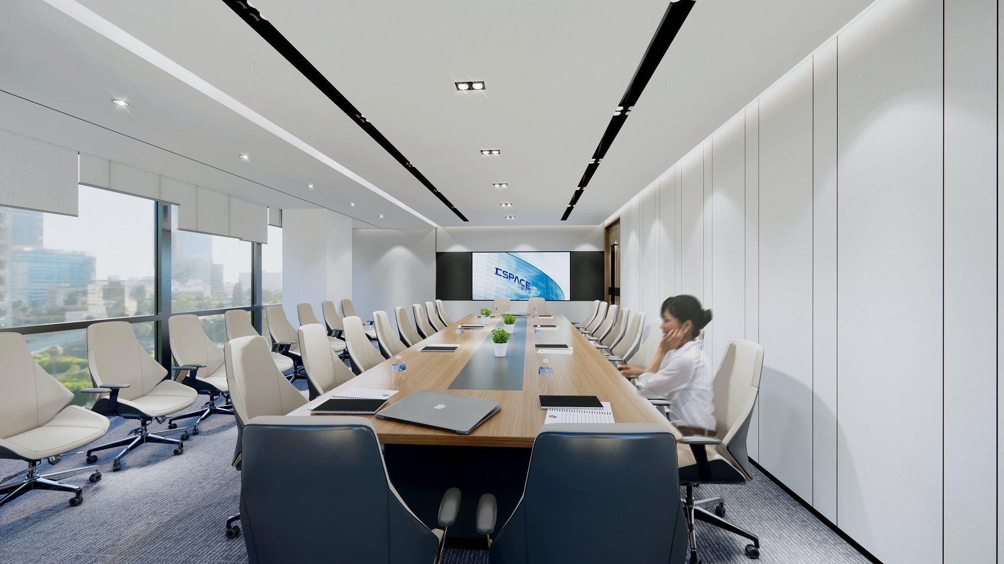 会议室整体的风格就是简单大气,作为接待客户及大型会议的一个场景。色彩过于多或造型复杂会给空间带来累赘。