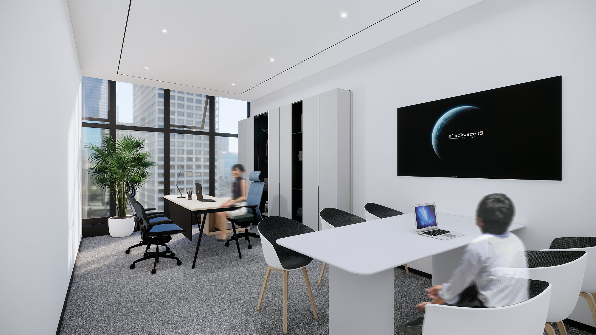 客户办公室是备用给客户出差使用,一人或多人次。所以我们在设计考虑上做小型会议形式展现,既可以提供客户的临时会议,也可以容纳多人次的临时办公室环境。