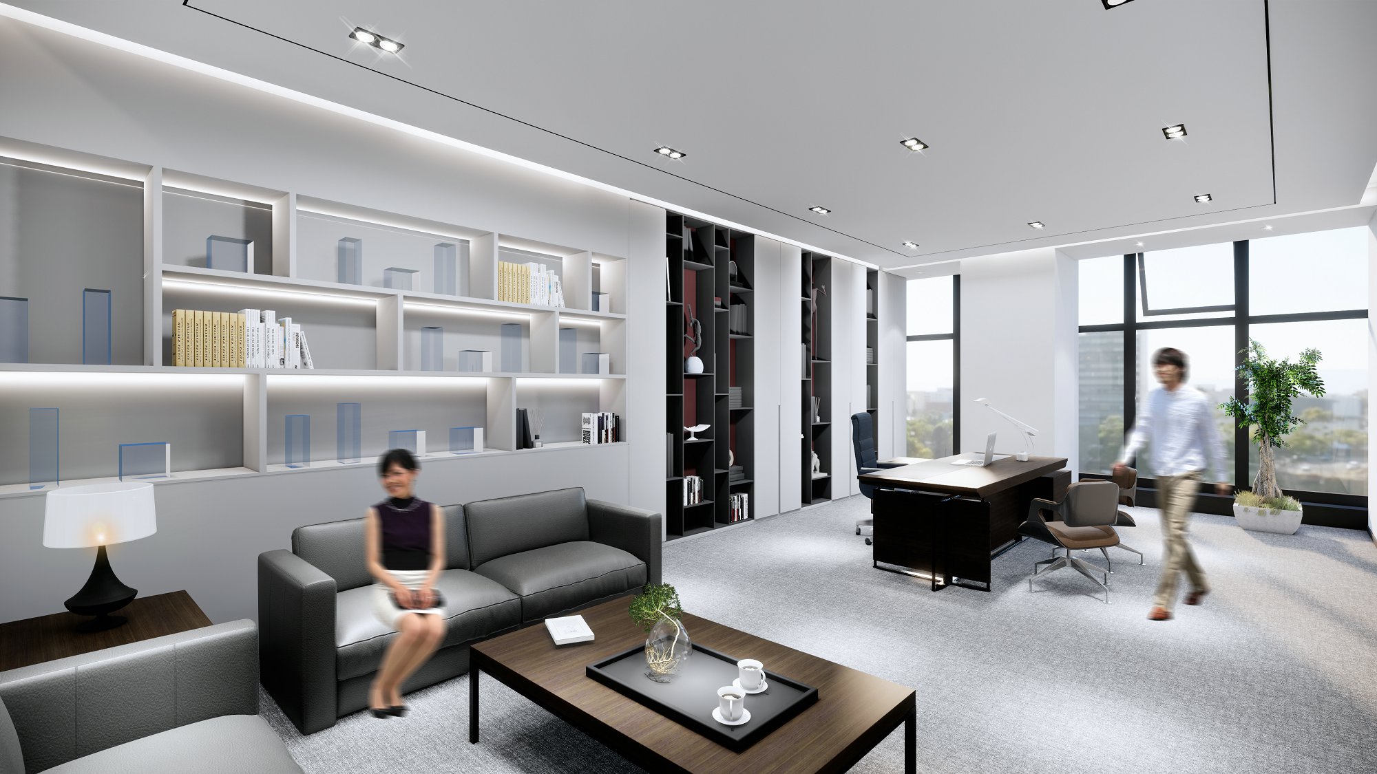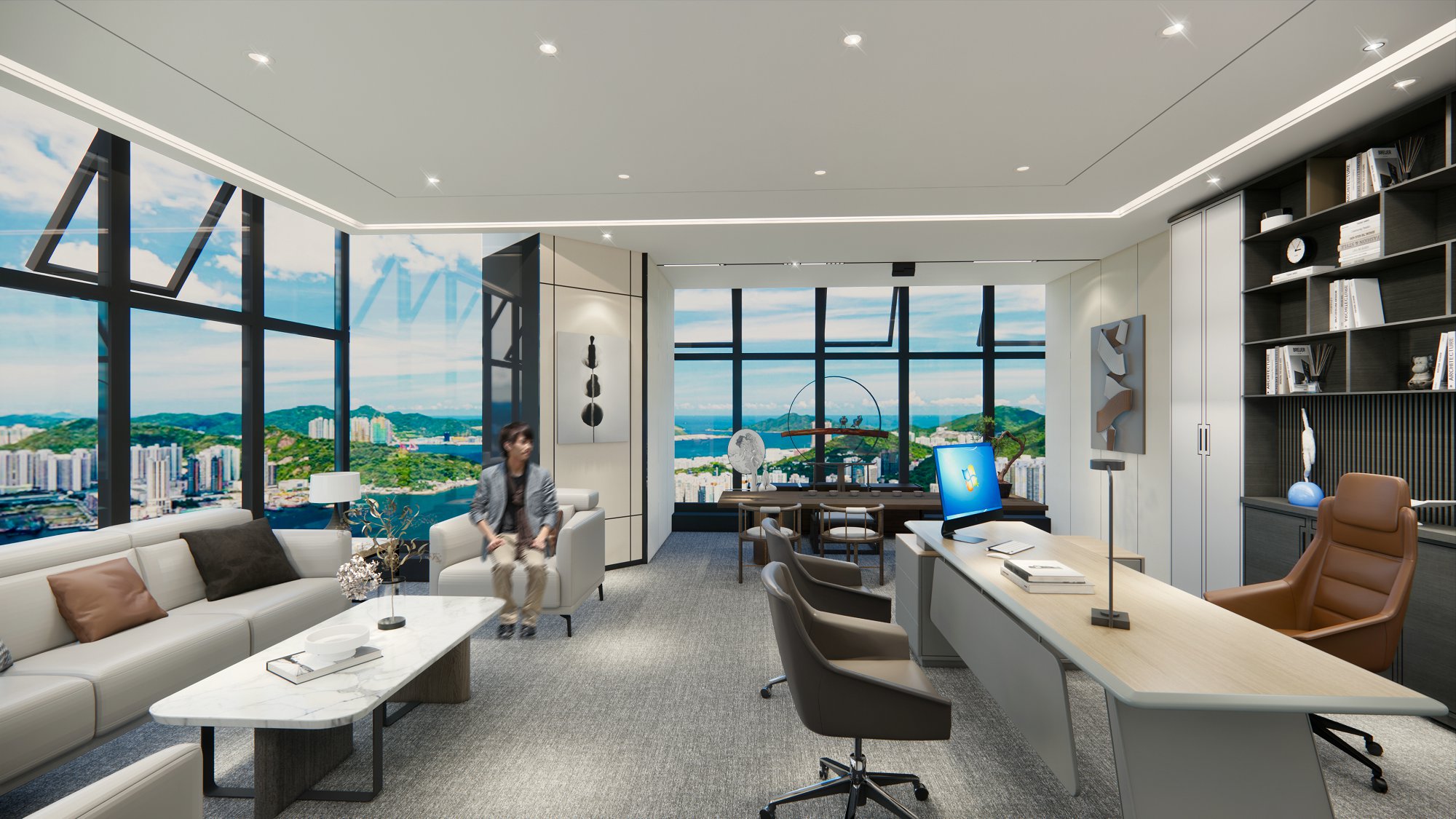 我们了解到总经理是一位年轻有位的男士。常年在国外居住,习惯西式的生活方式。所以我们在设计的时候综合考量,在总经理办公室设计有展示酒柜、红酒吧台、西式简约的接待沙发、休闲单椅。在饰面材料的挑选上年轻化,做到既简约又有品质的空间。