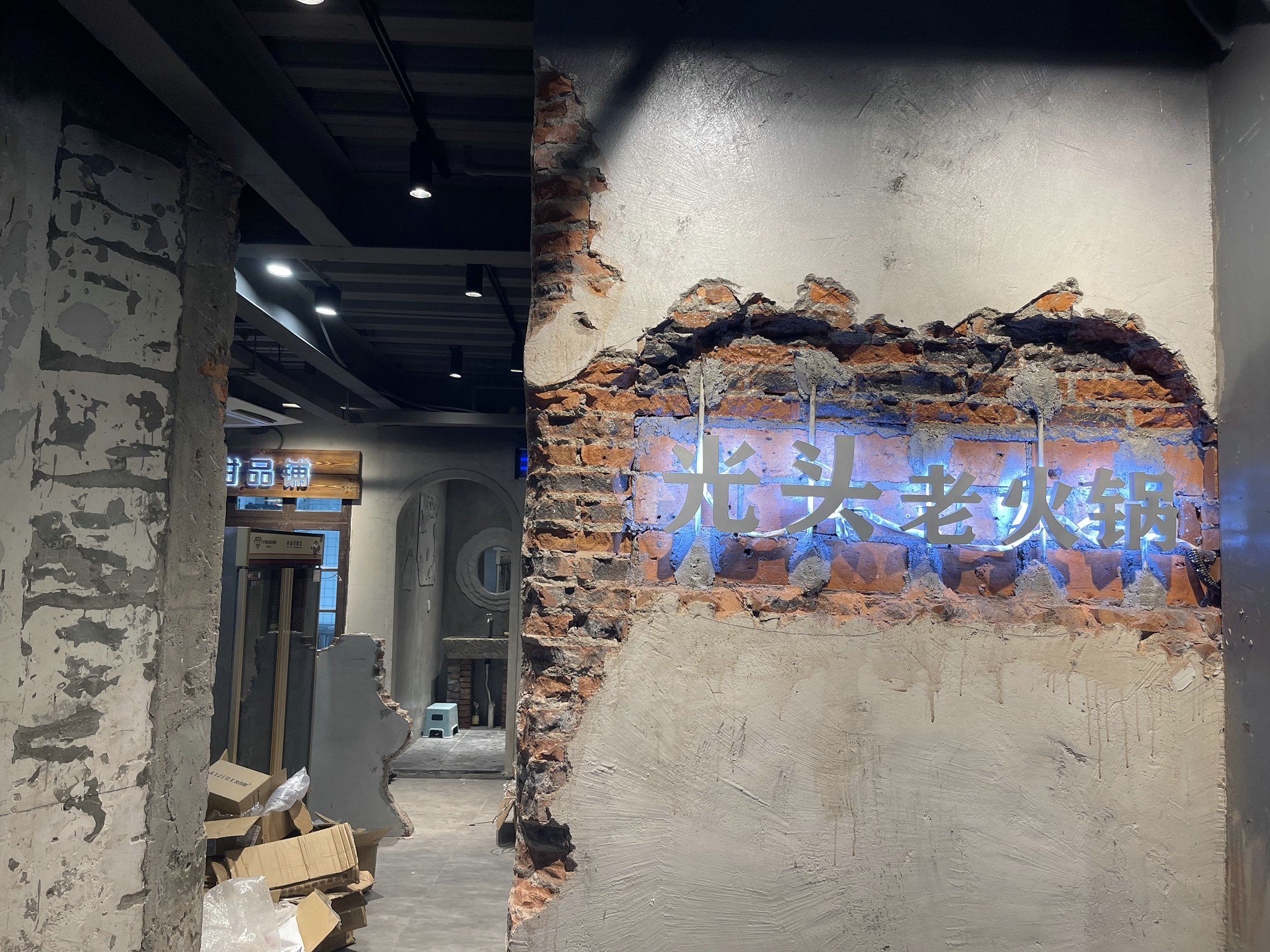 大厅由矮墙分割区域,在那里我们费了很多心思与时间,需要建好墙体,然后重复的砸墙修整造型。刮去部分水泥层。墙面预备贴旧海报画,展示柜放置年代感的老物件,让客户怀旧的情怀一下怦然而起。